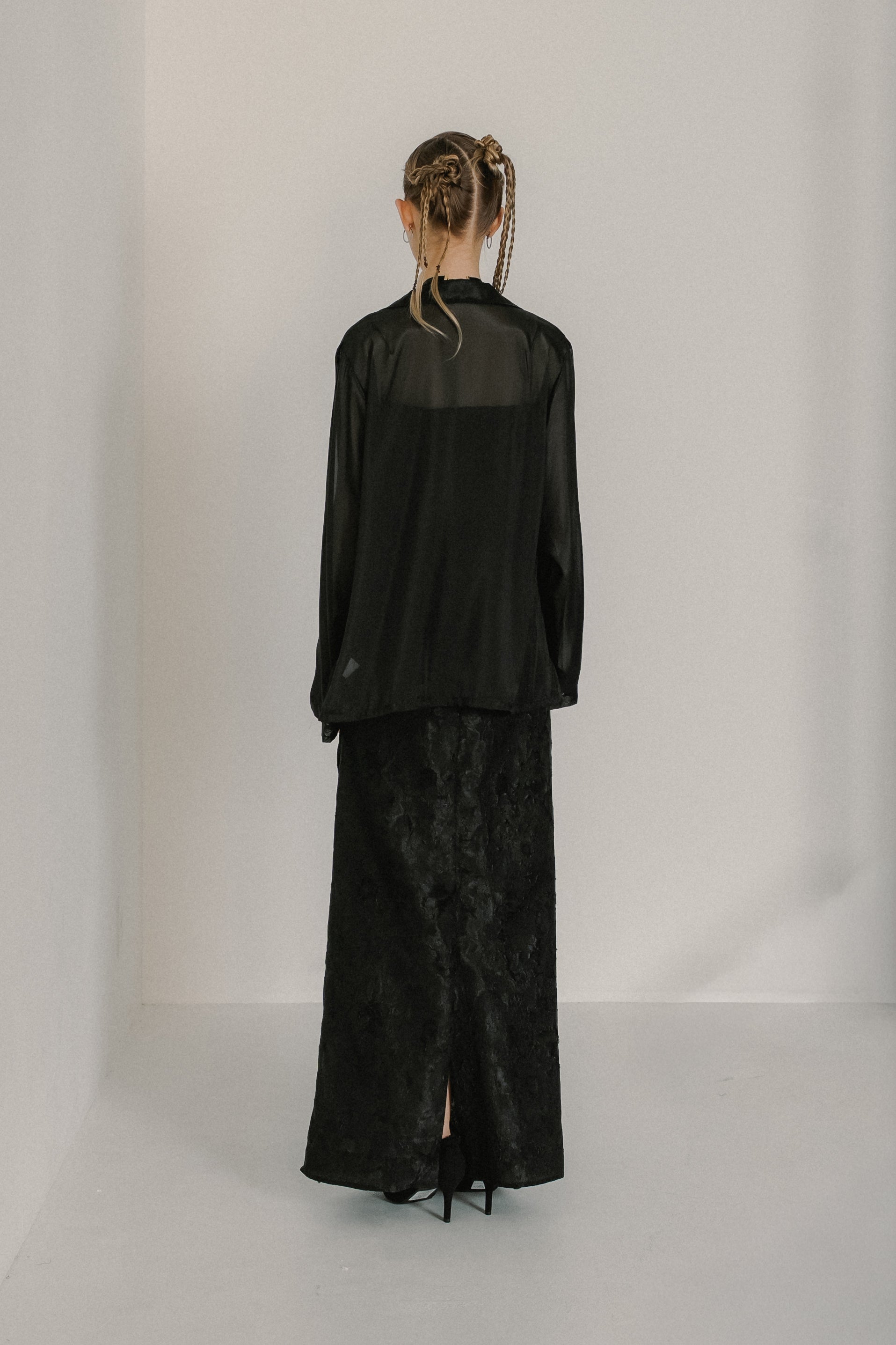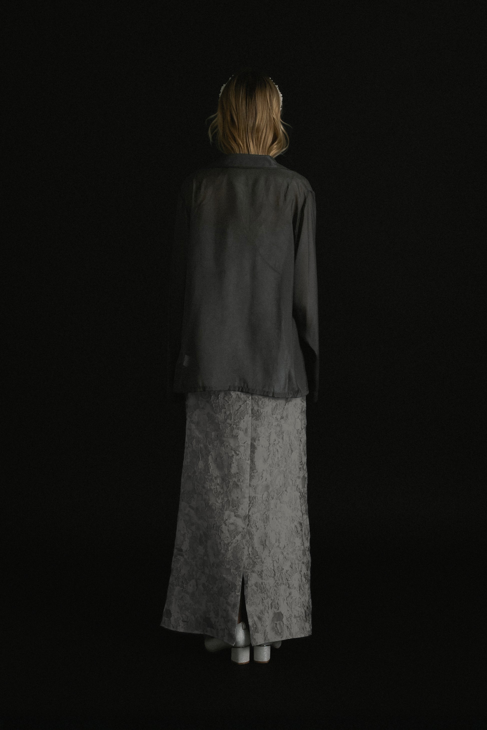 程よくハリのあるシアー素材を使用することで、身体のラインを拾いすぎず、羽織るだけで洗練されたシルエットに。