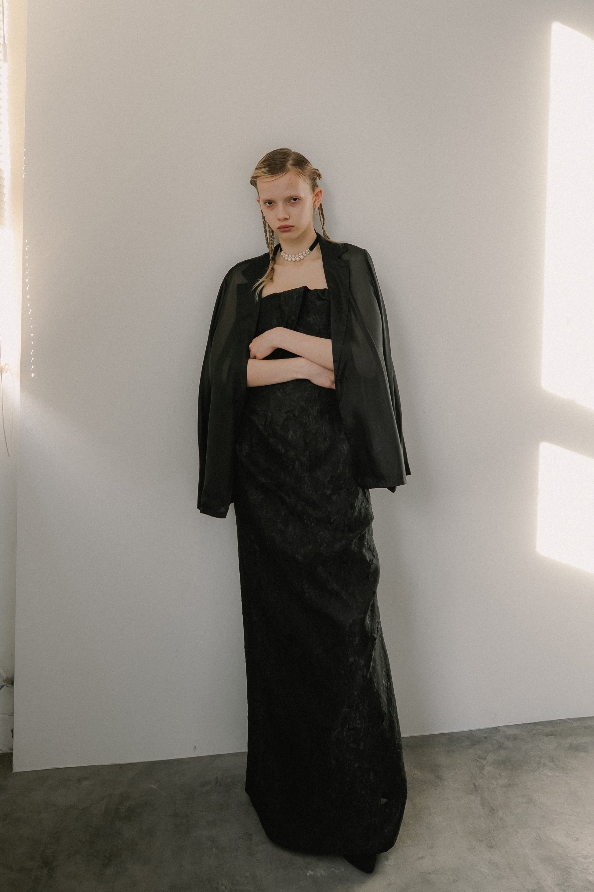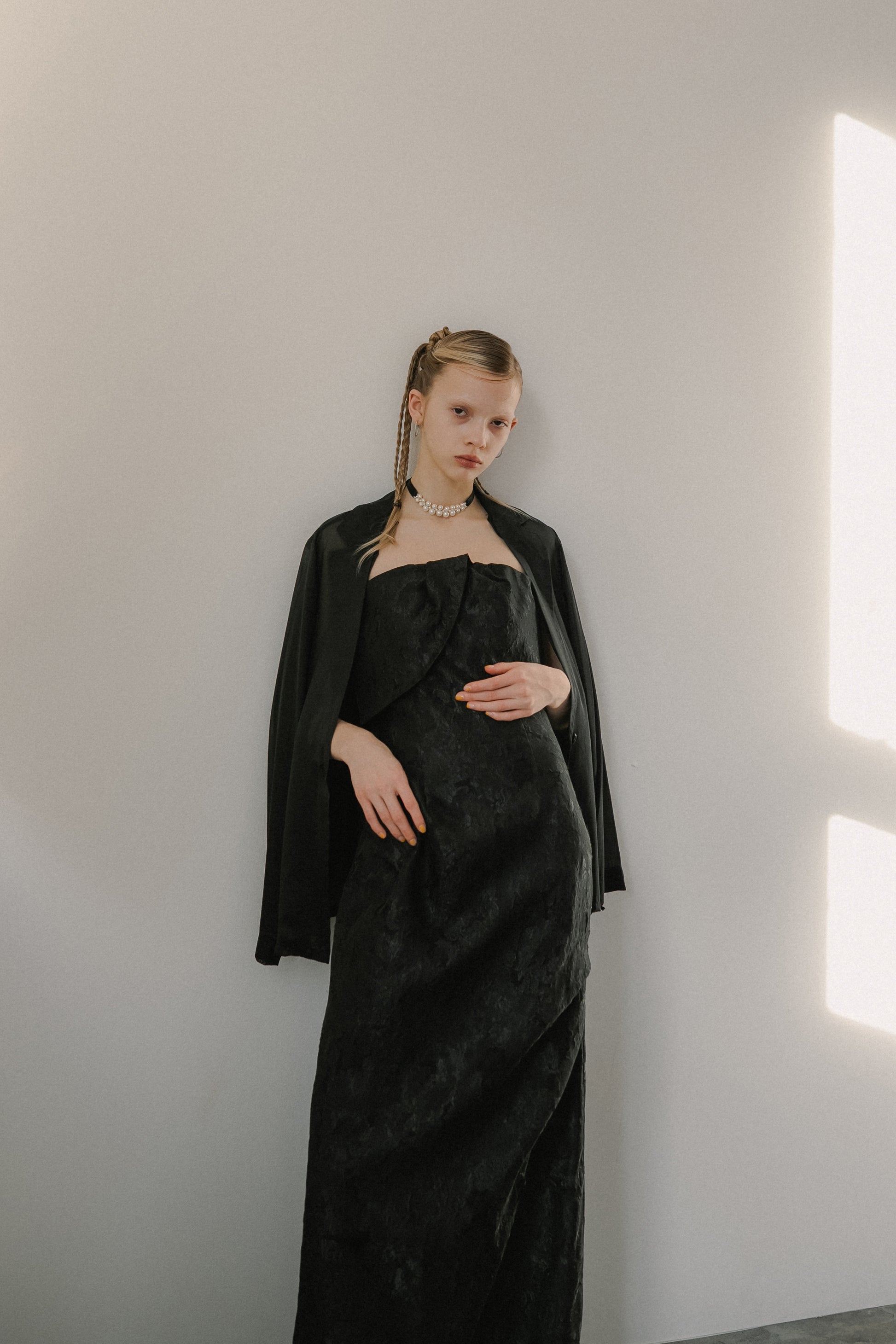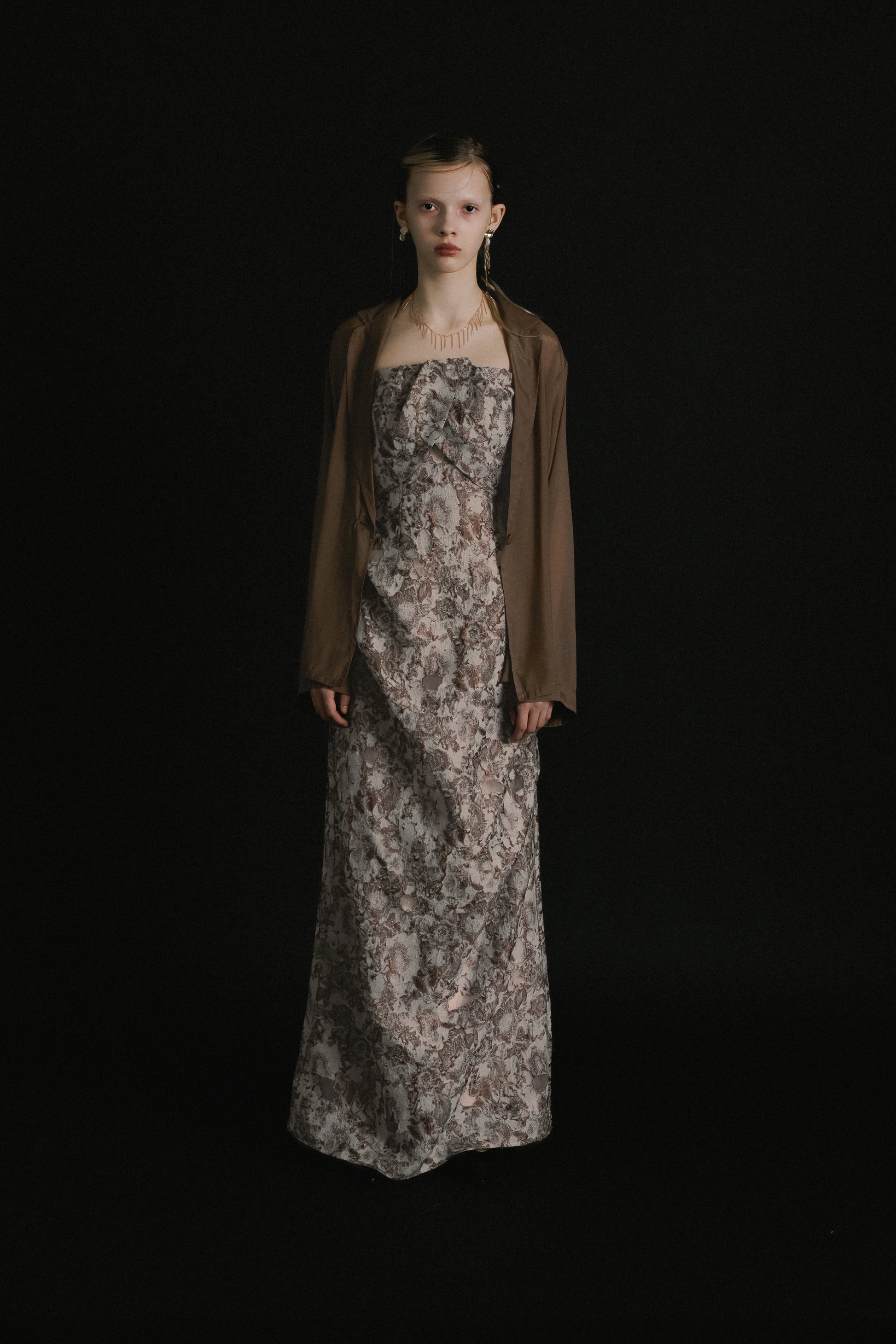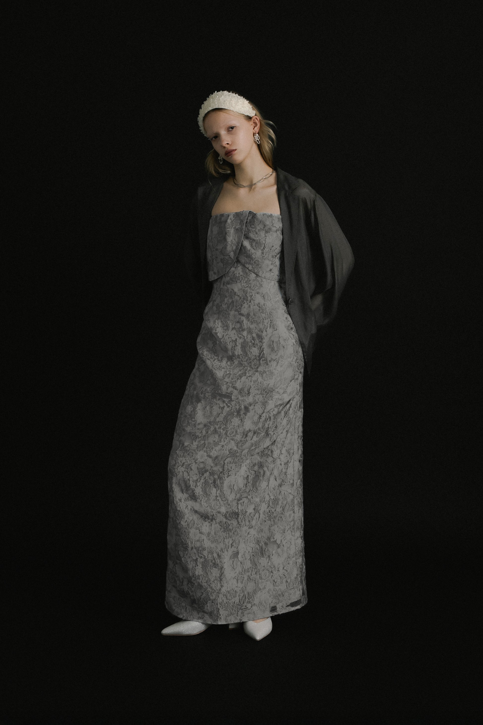 フロントはあえてミニマルに仕上げ、ドレスのデザインを引き立てるバランスに。