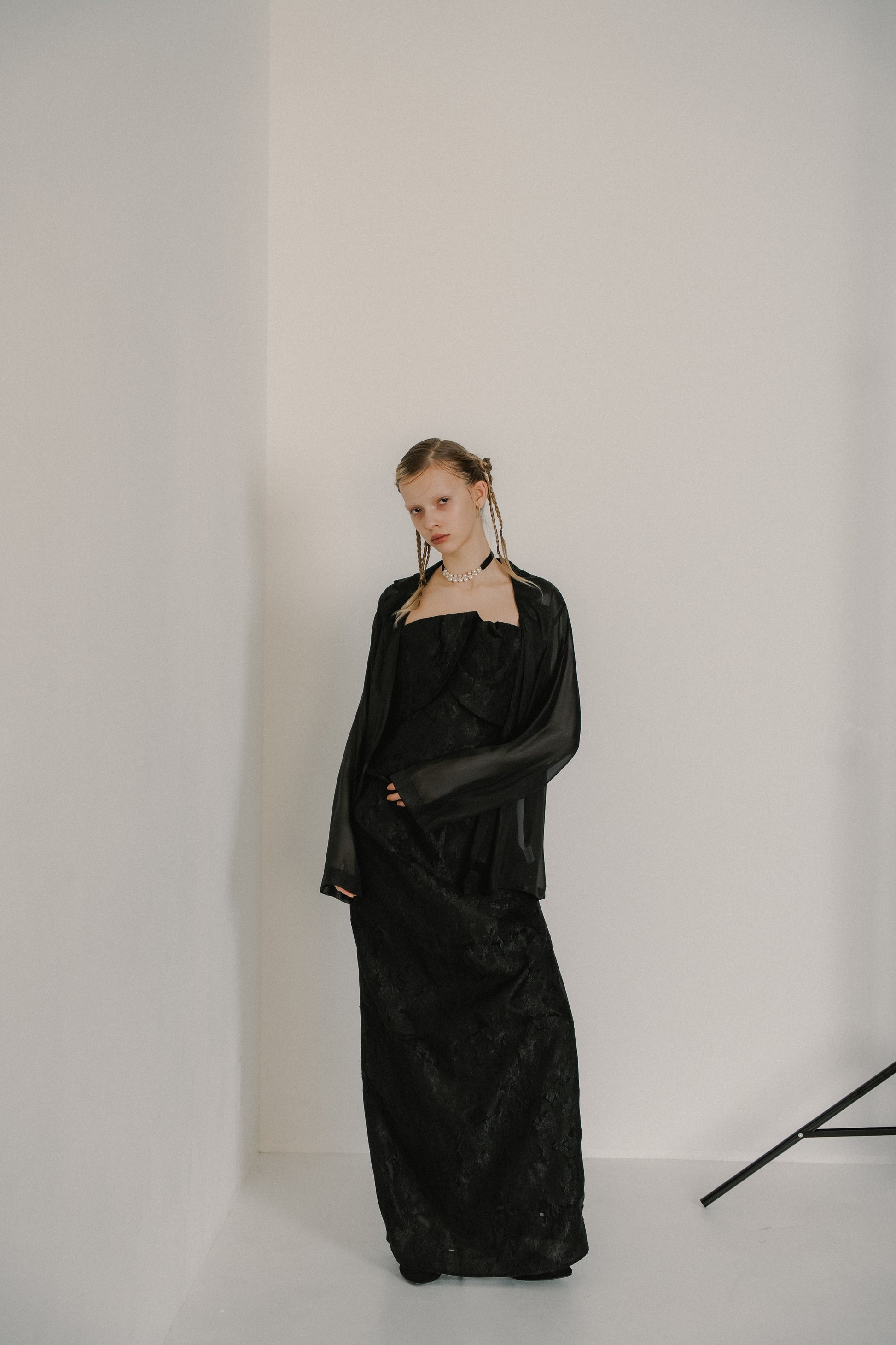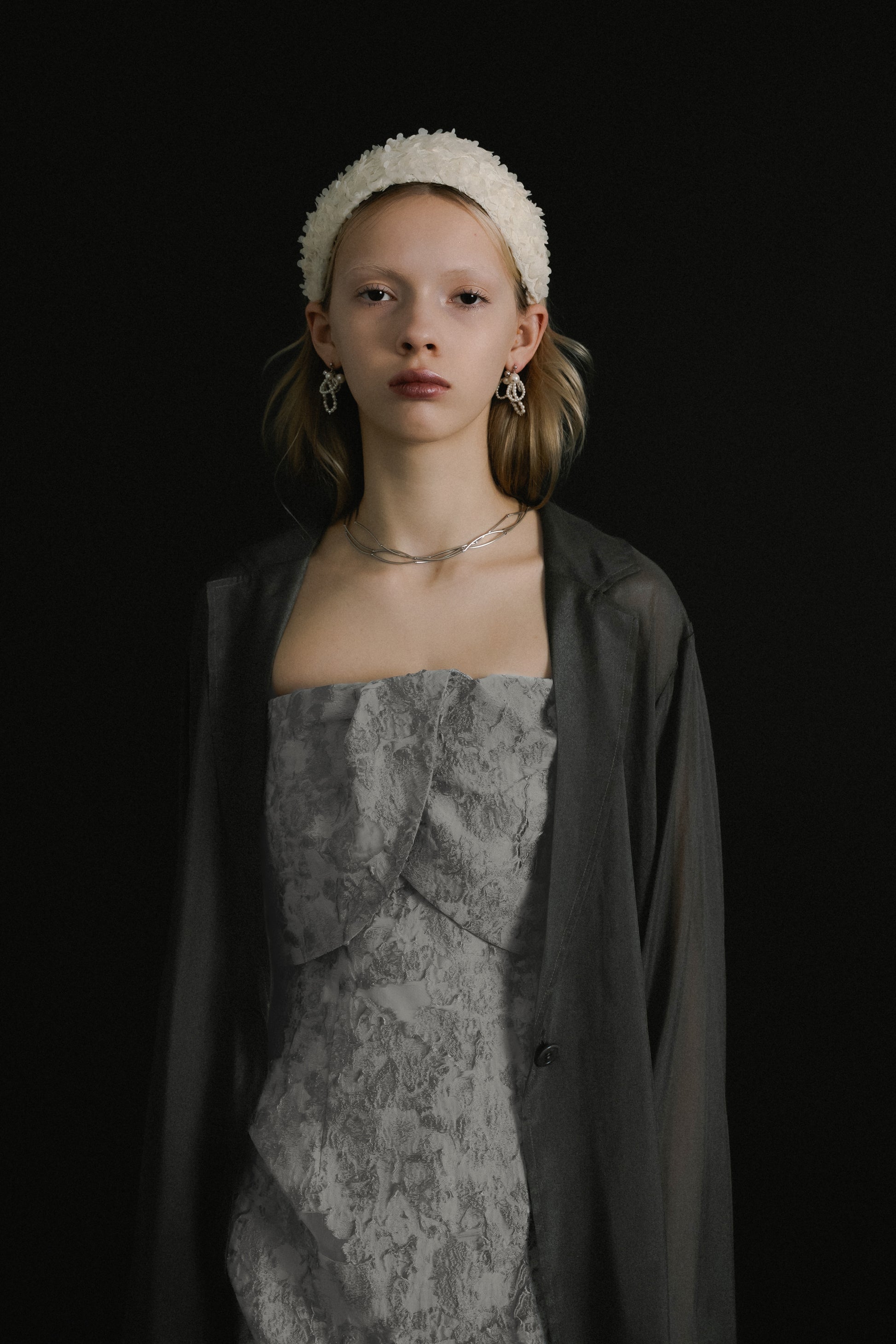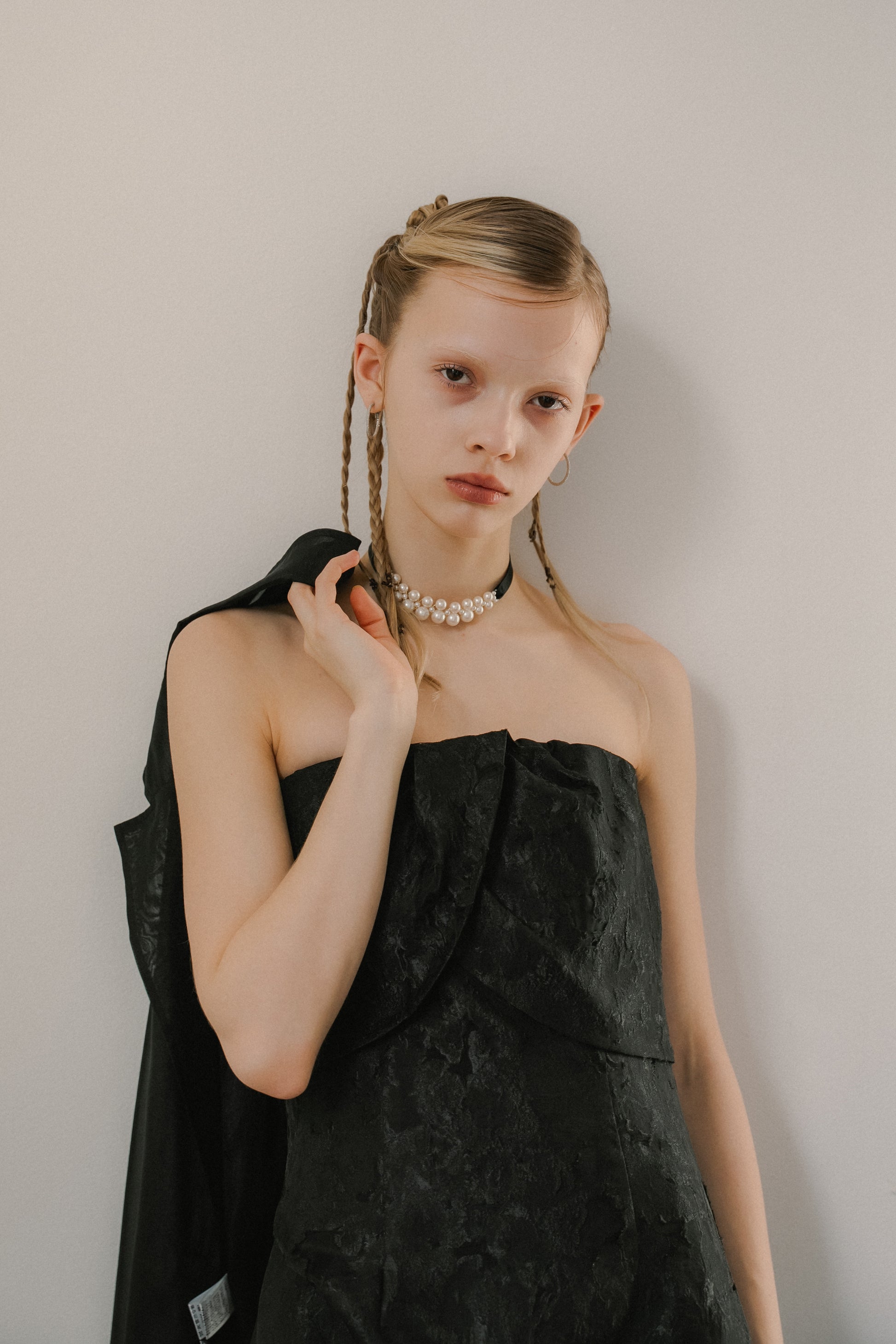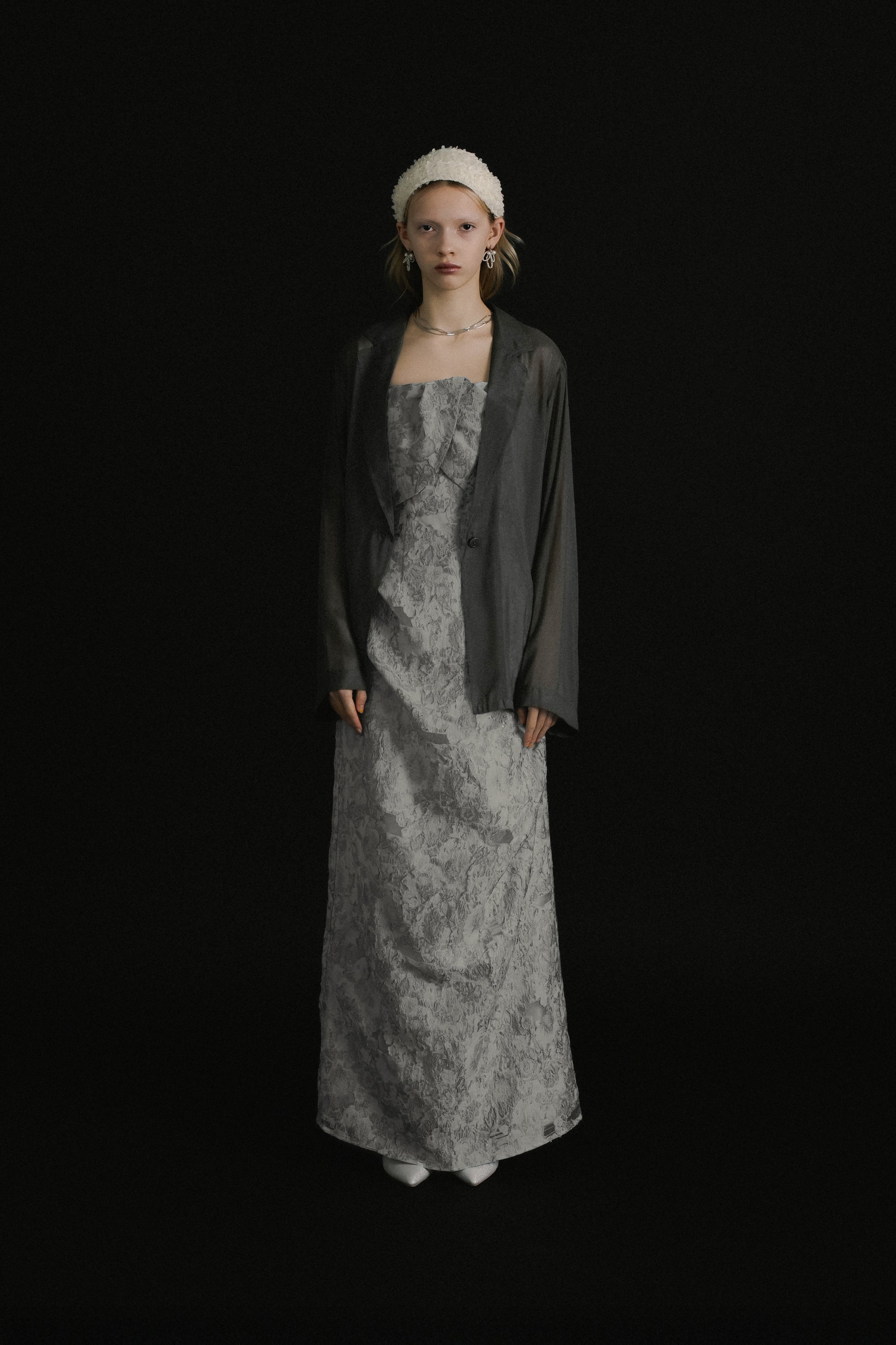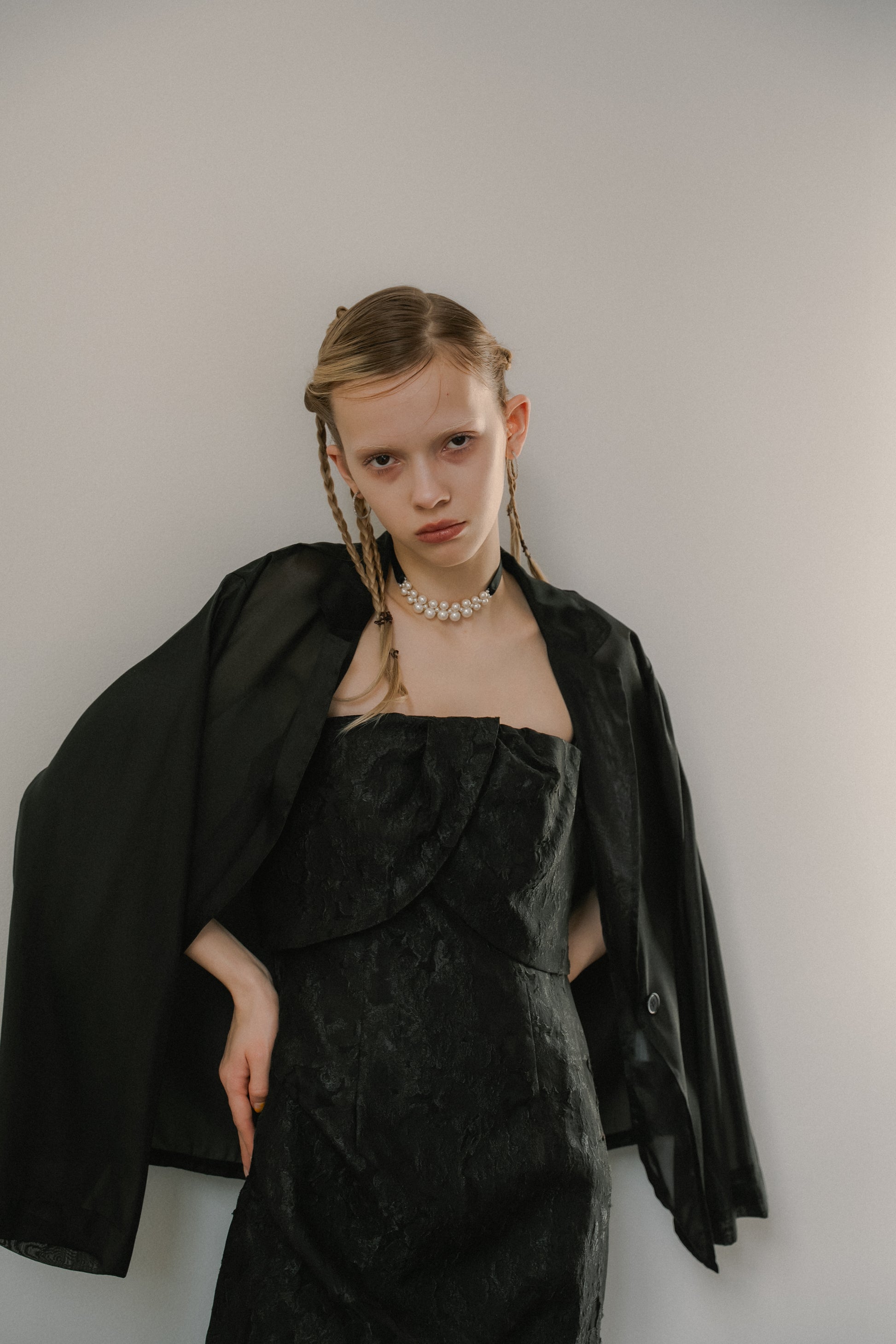 フロントはあえてミニマルに仕上げ、ドレスのデザインを引き立てるバランスに。