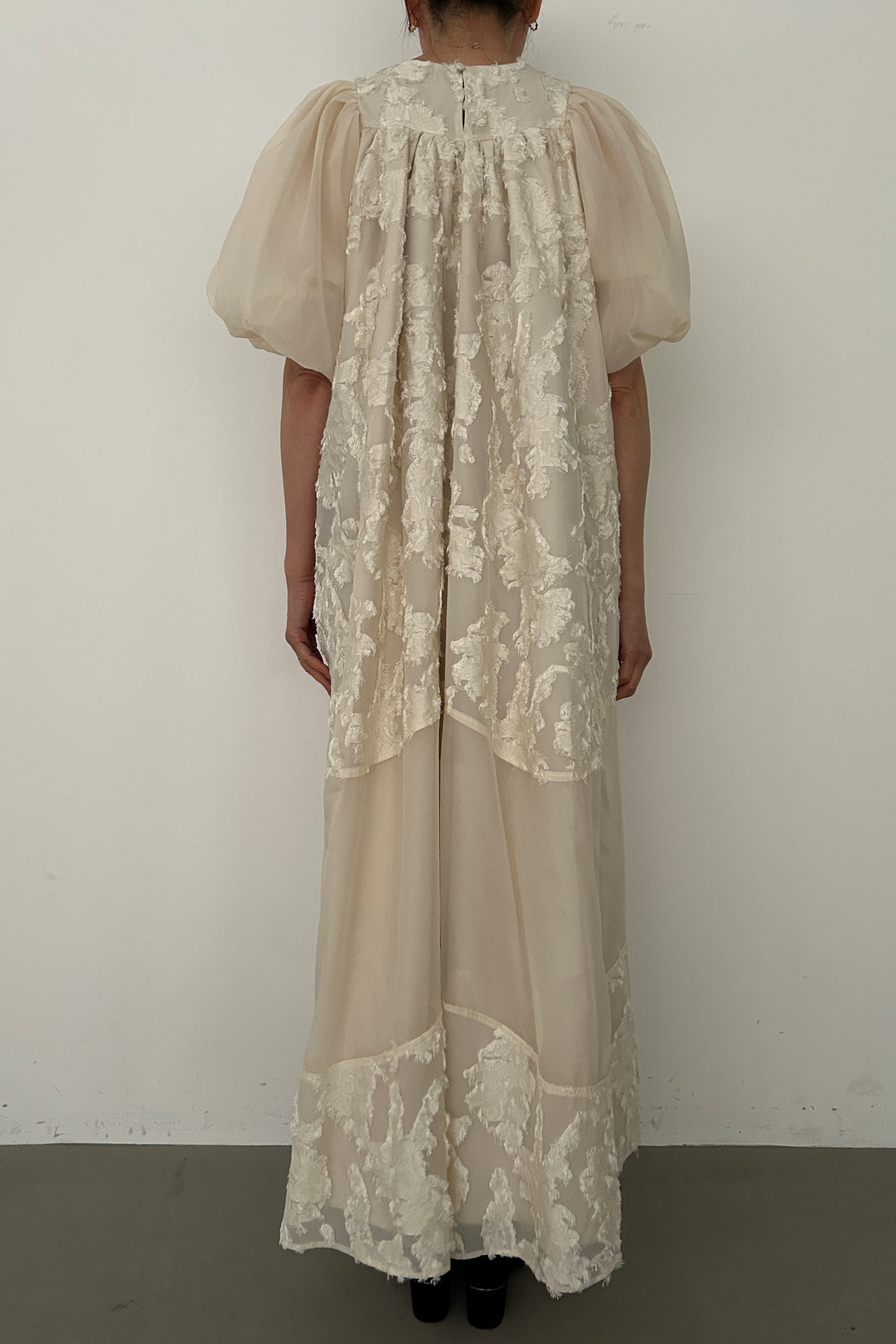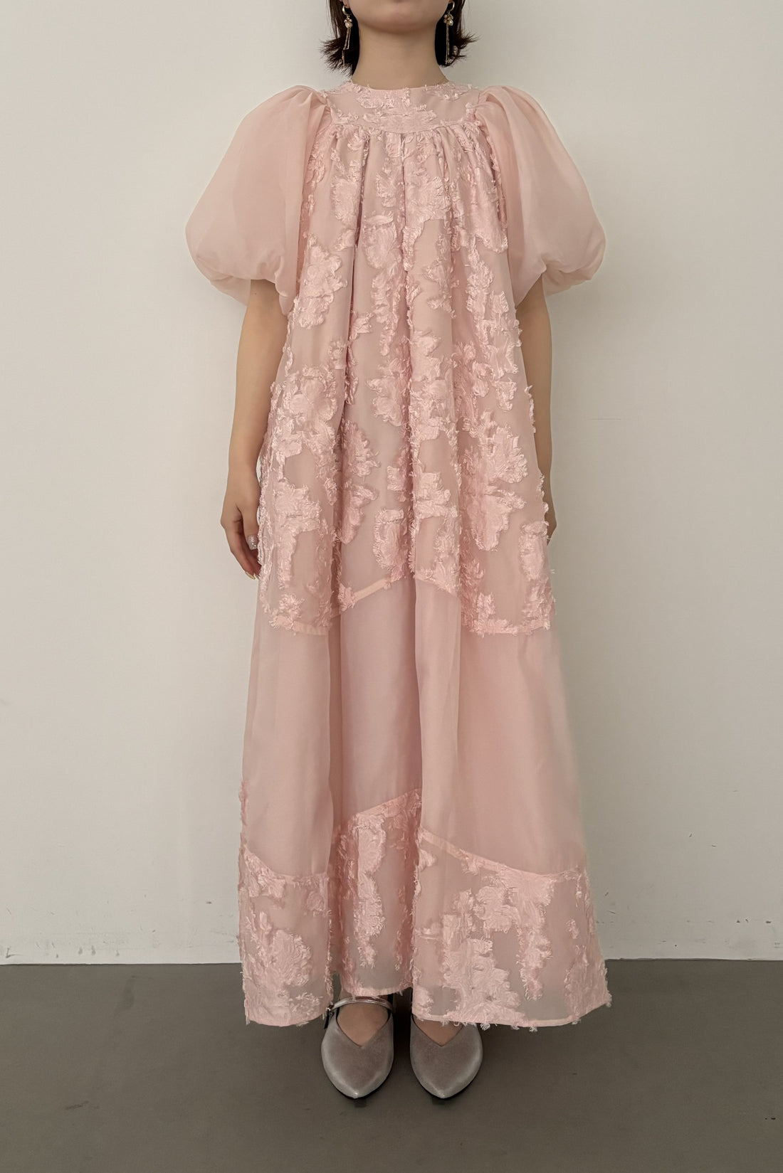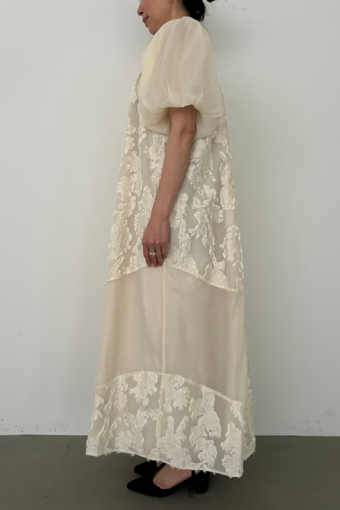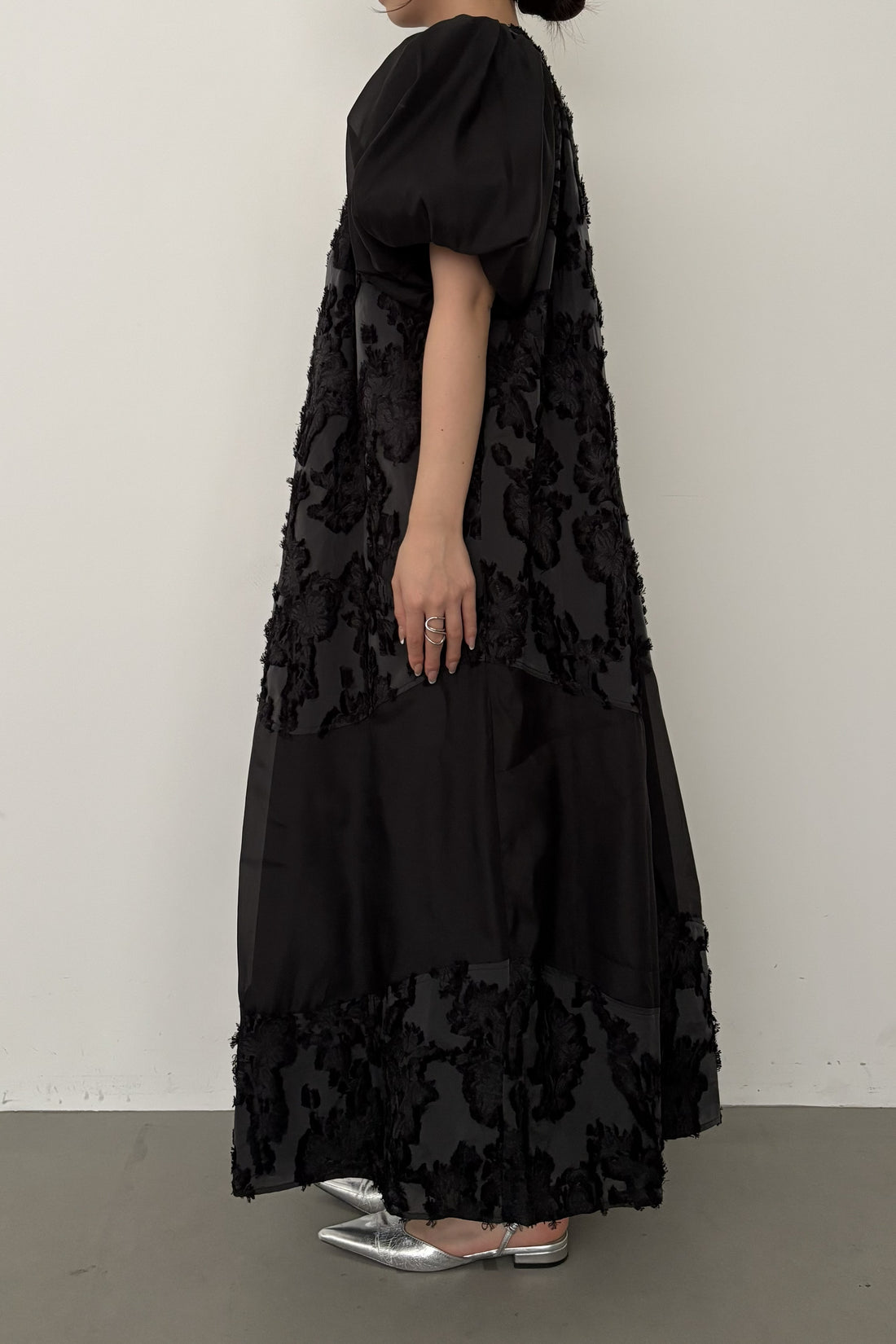 ・立体的なフラワージャカードが目を惹く、存在感のあるロングドレス。