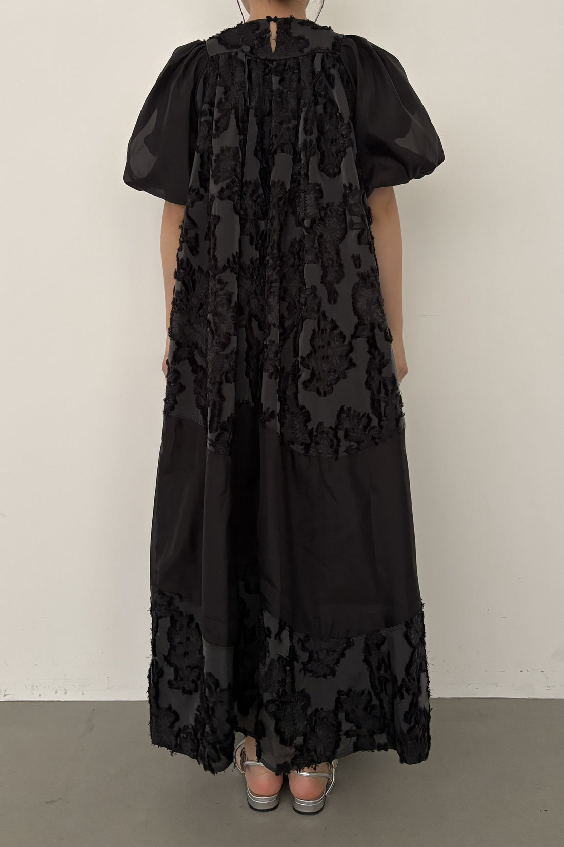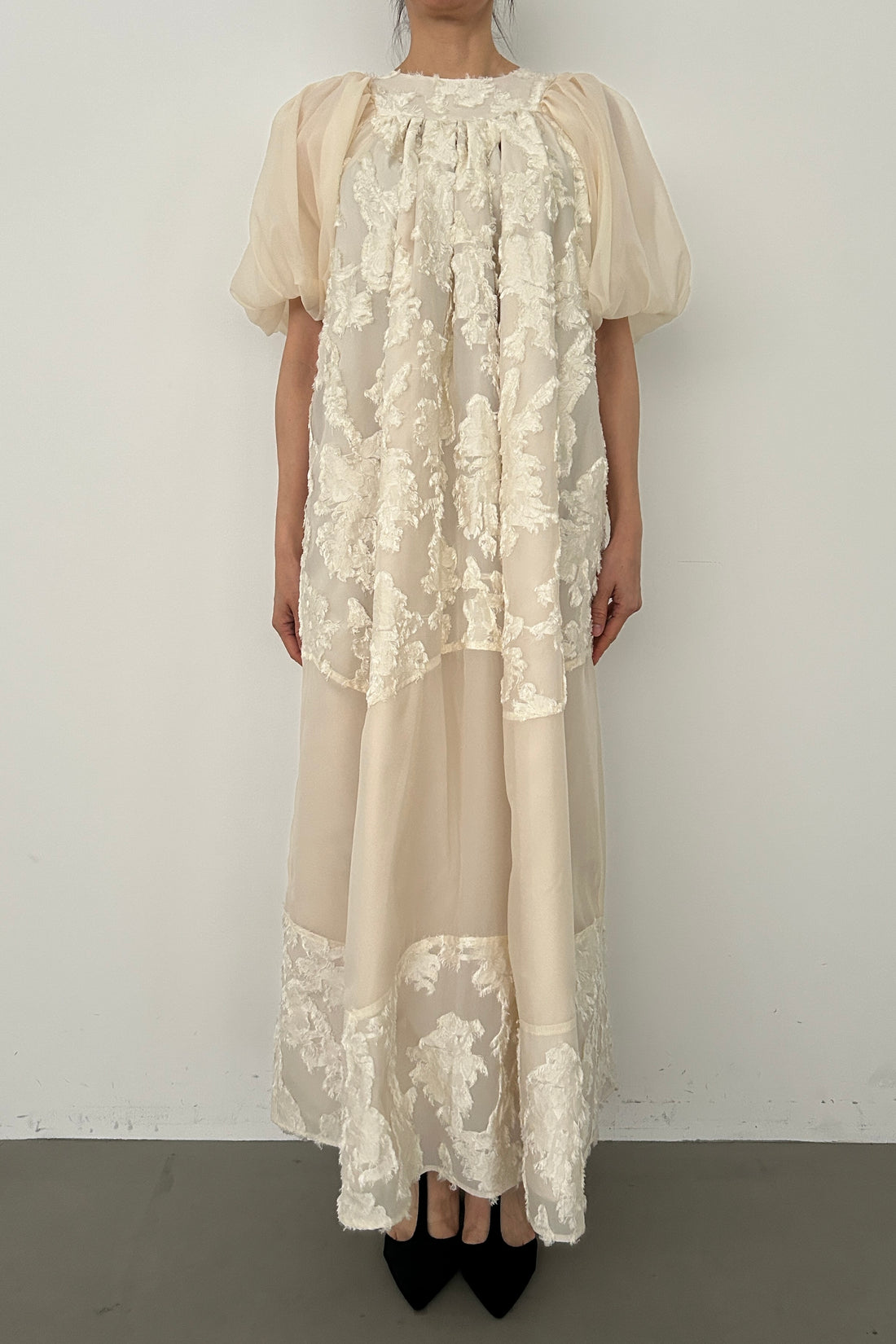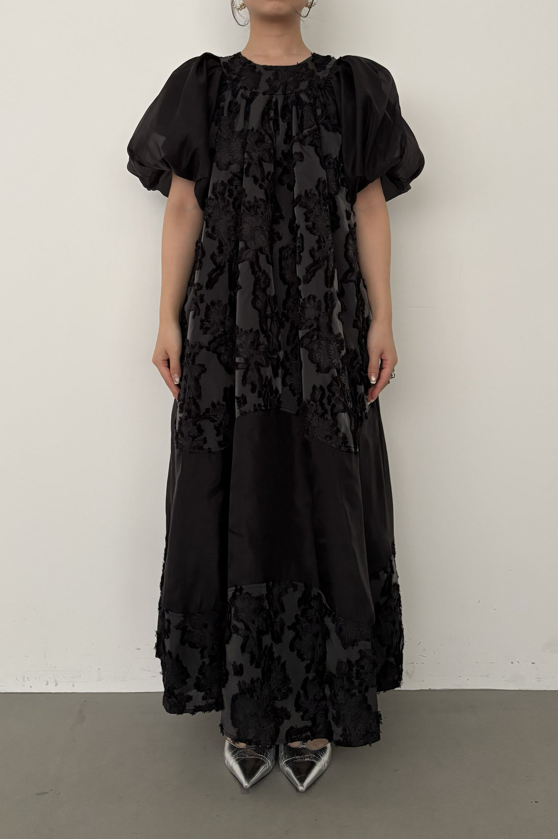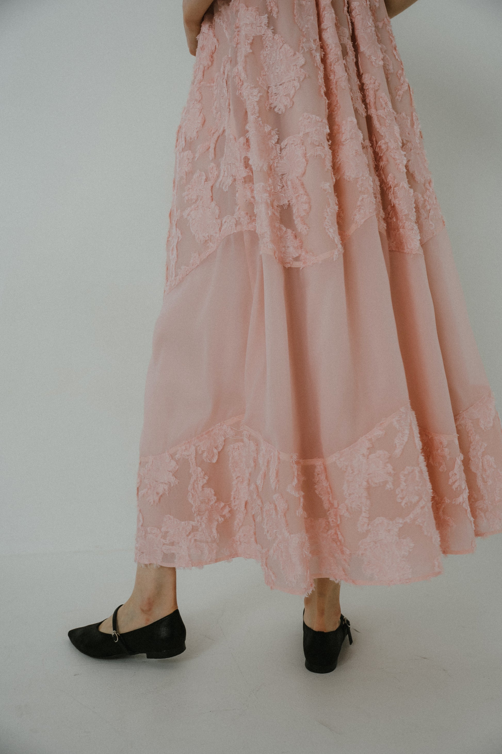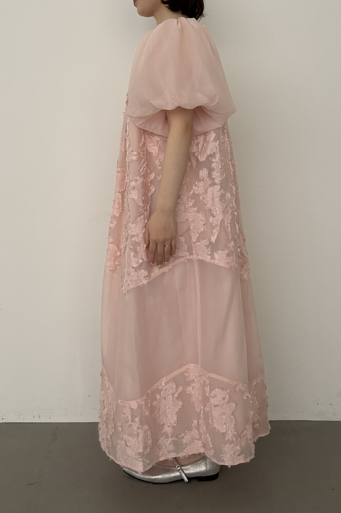 ・立体的なフラワージャカードが目を惹く、存在感のあるロングドレス。