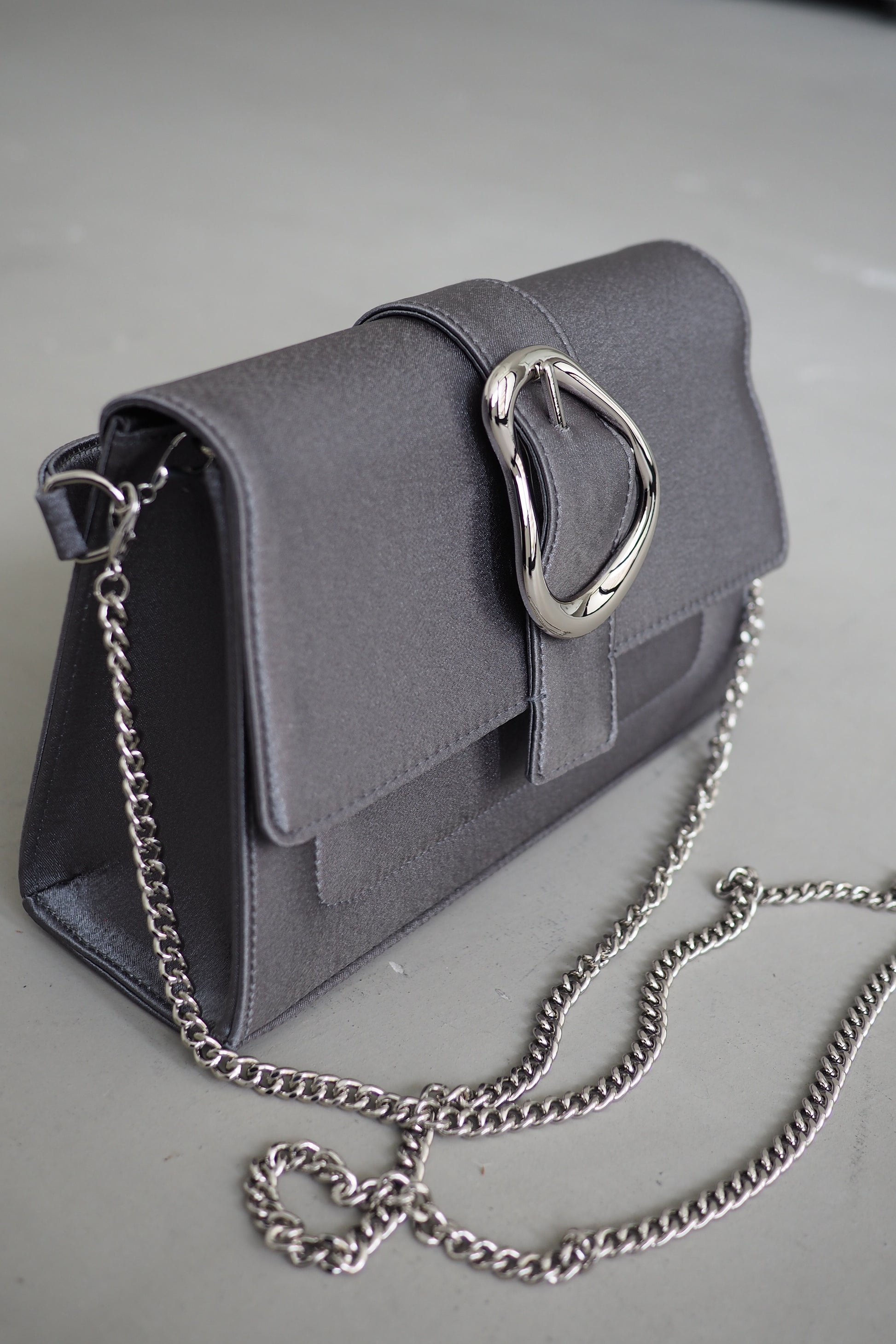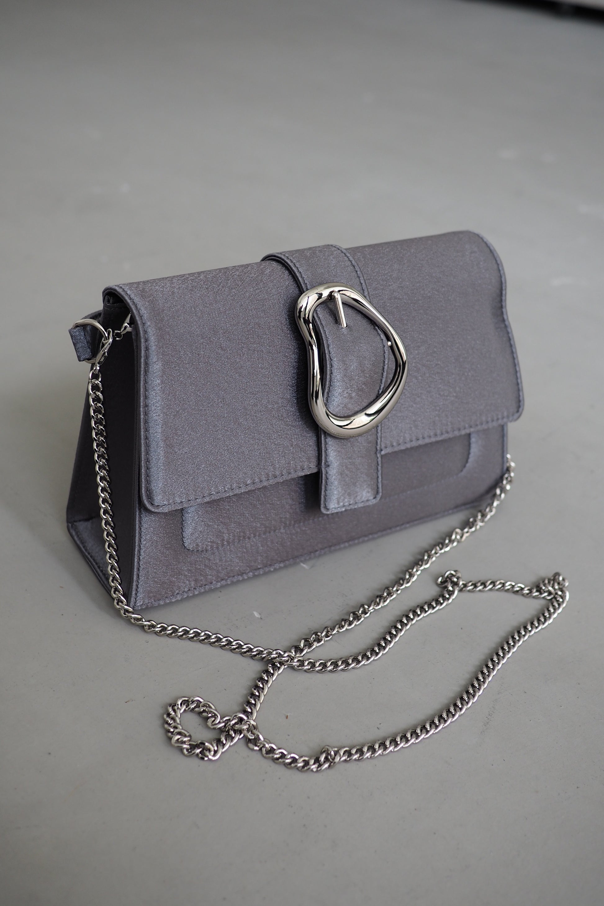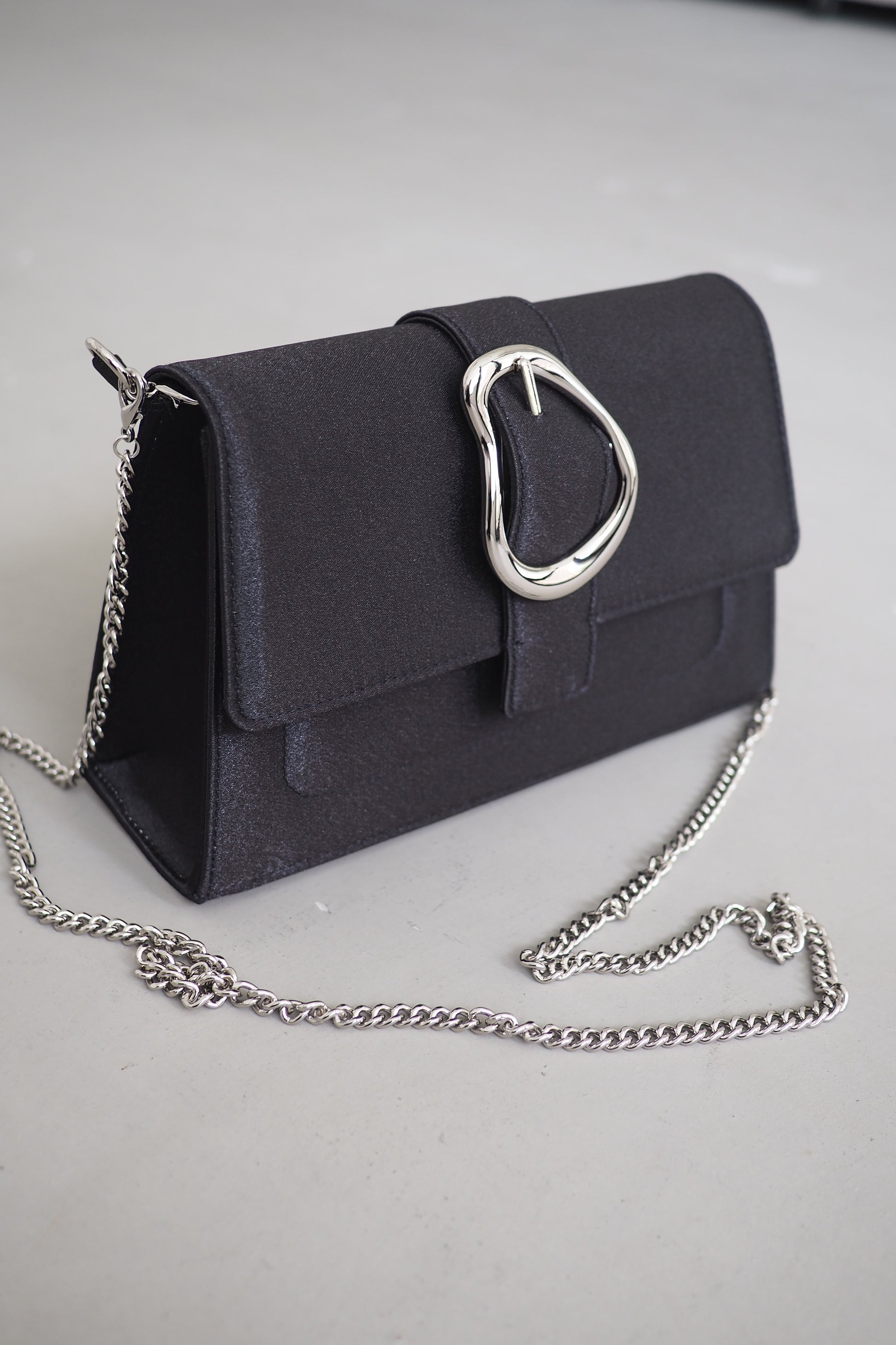 ・エッジの効いたアートのようなメタルバックルが目を惹く、モダン&エレガントなチェーンバッグ