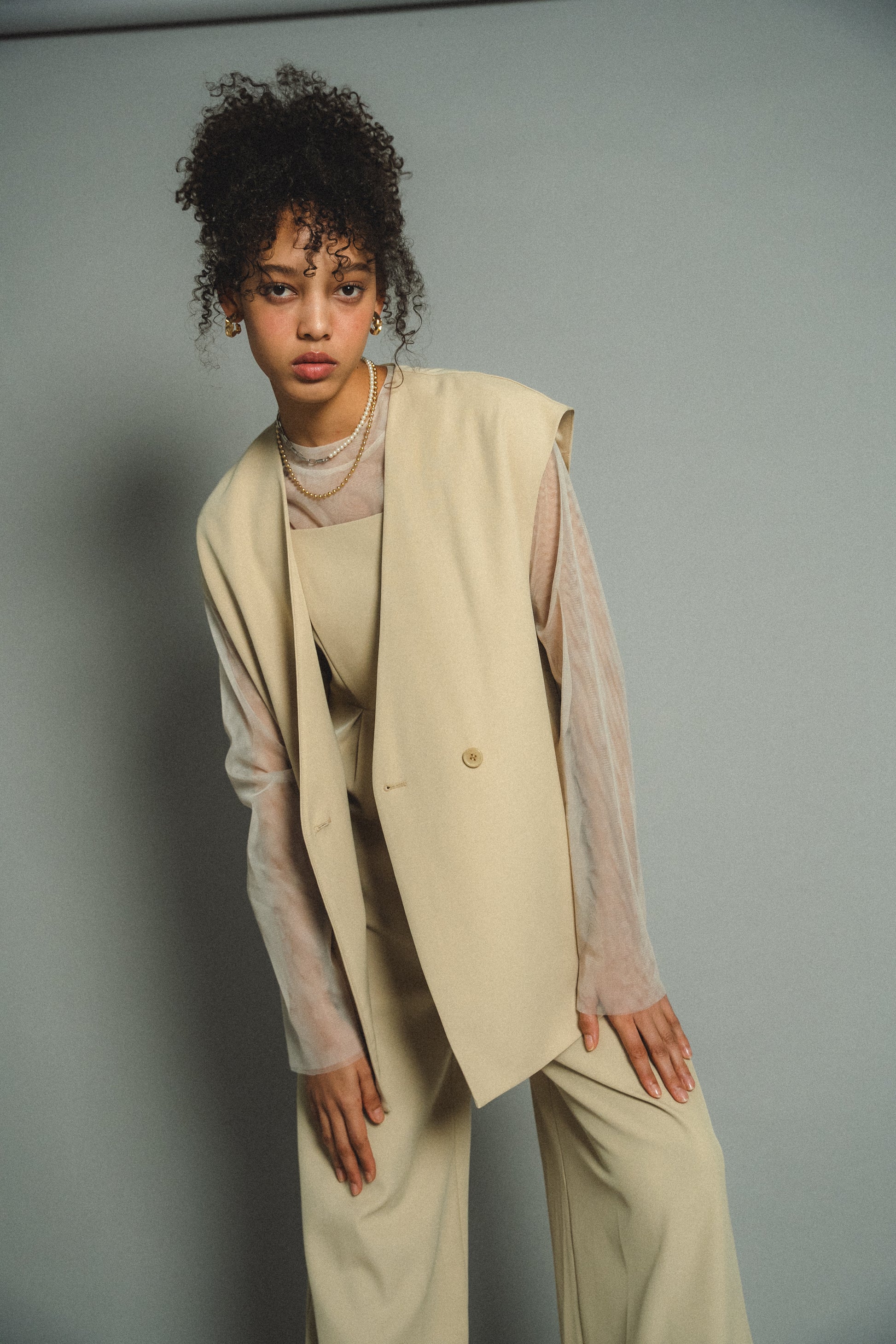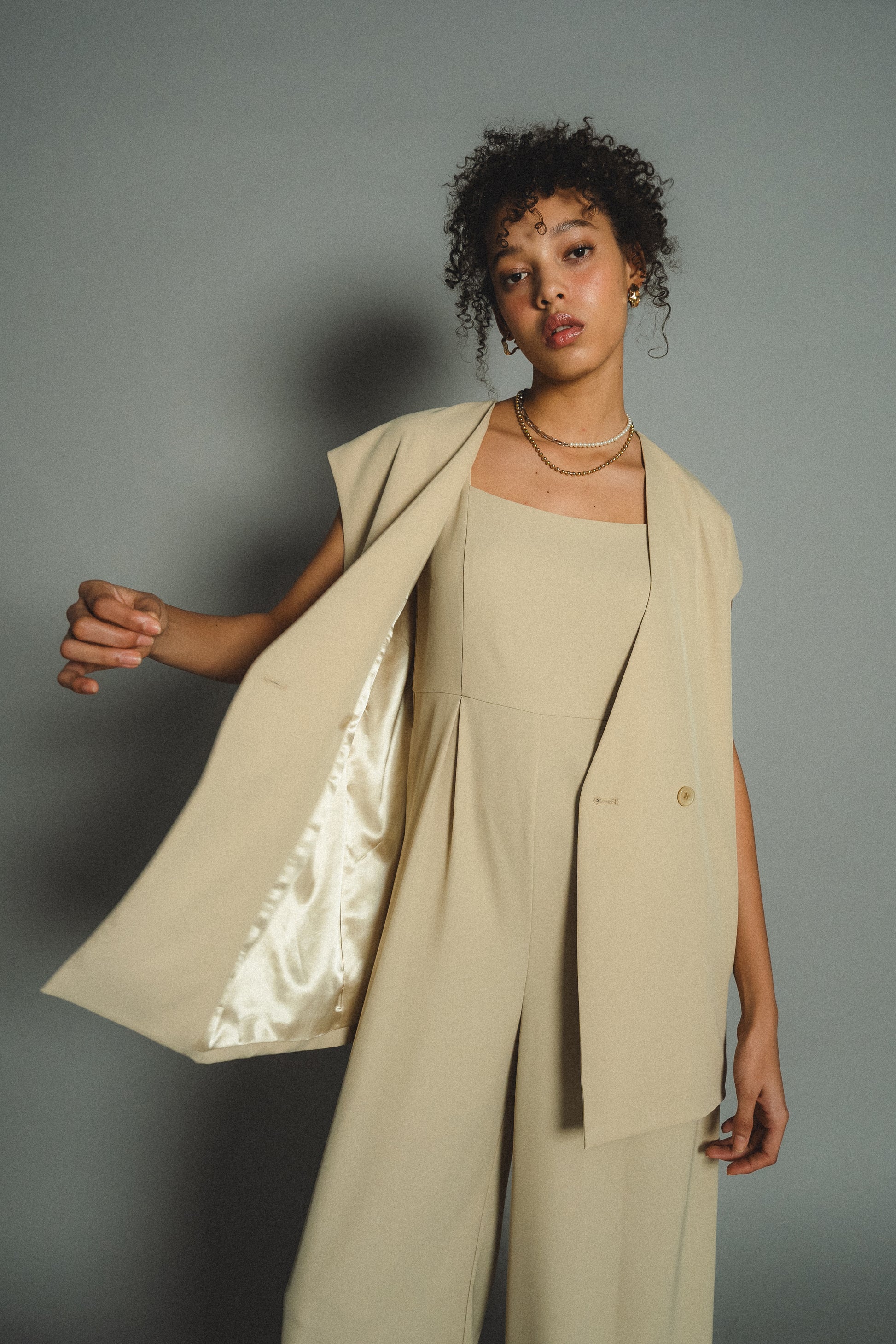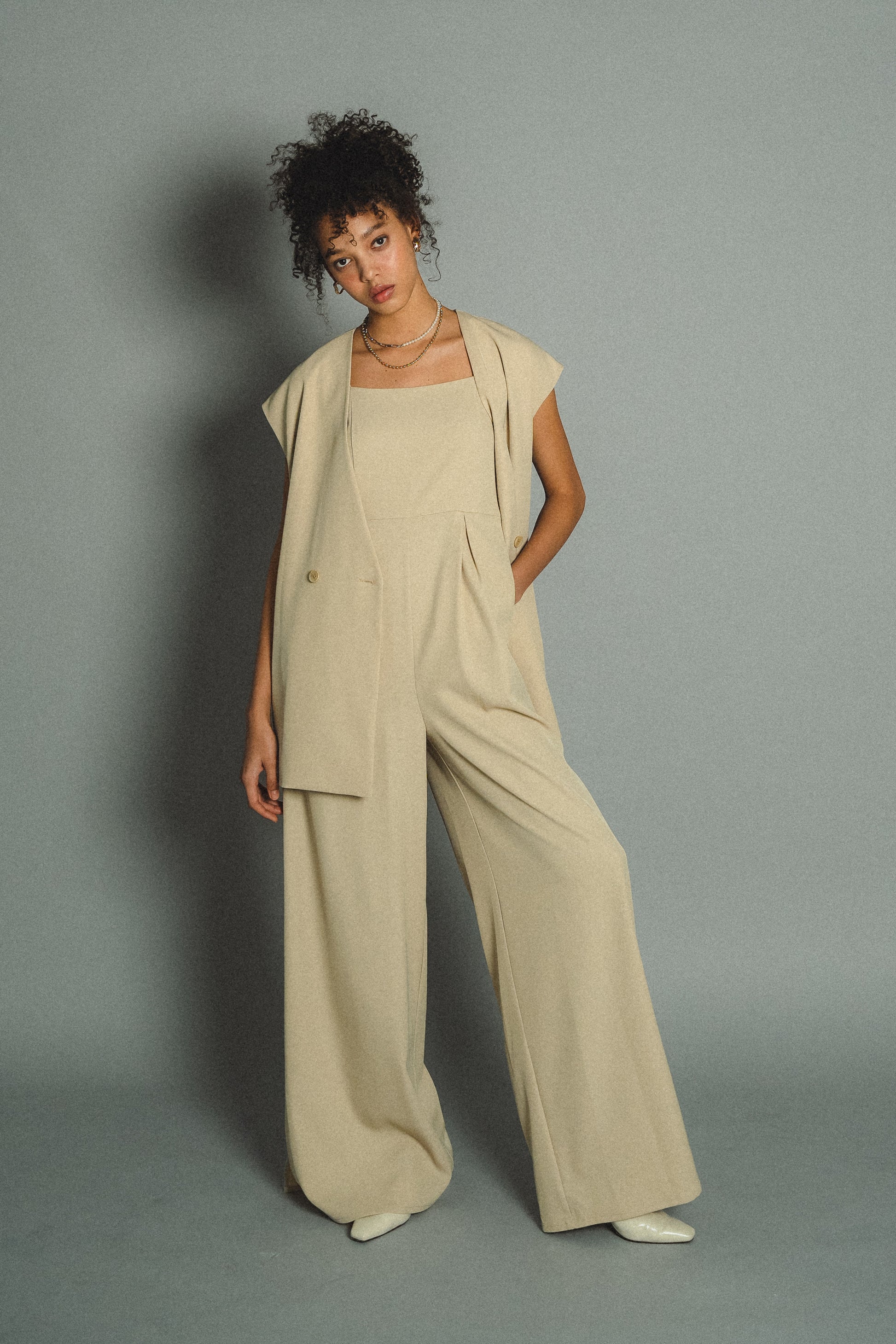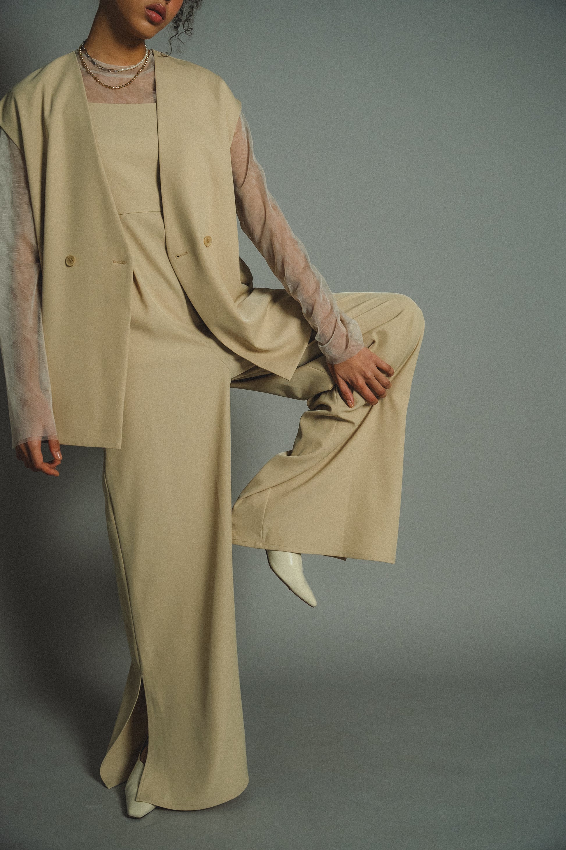 ・すっきりとしたノーカラーベストはヒップが隠れる長めの着丈でスタイルアップ効果も叶います