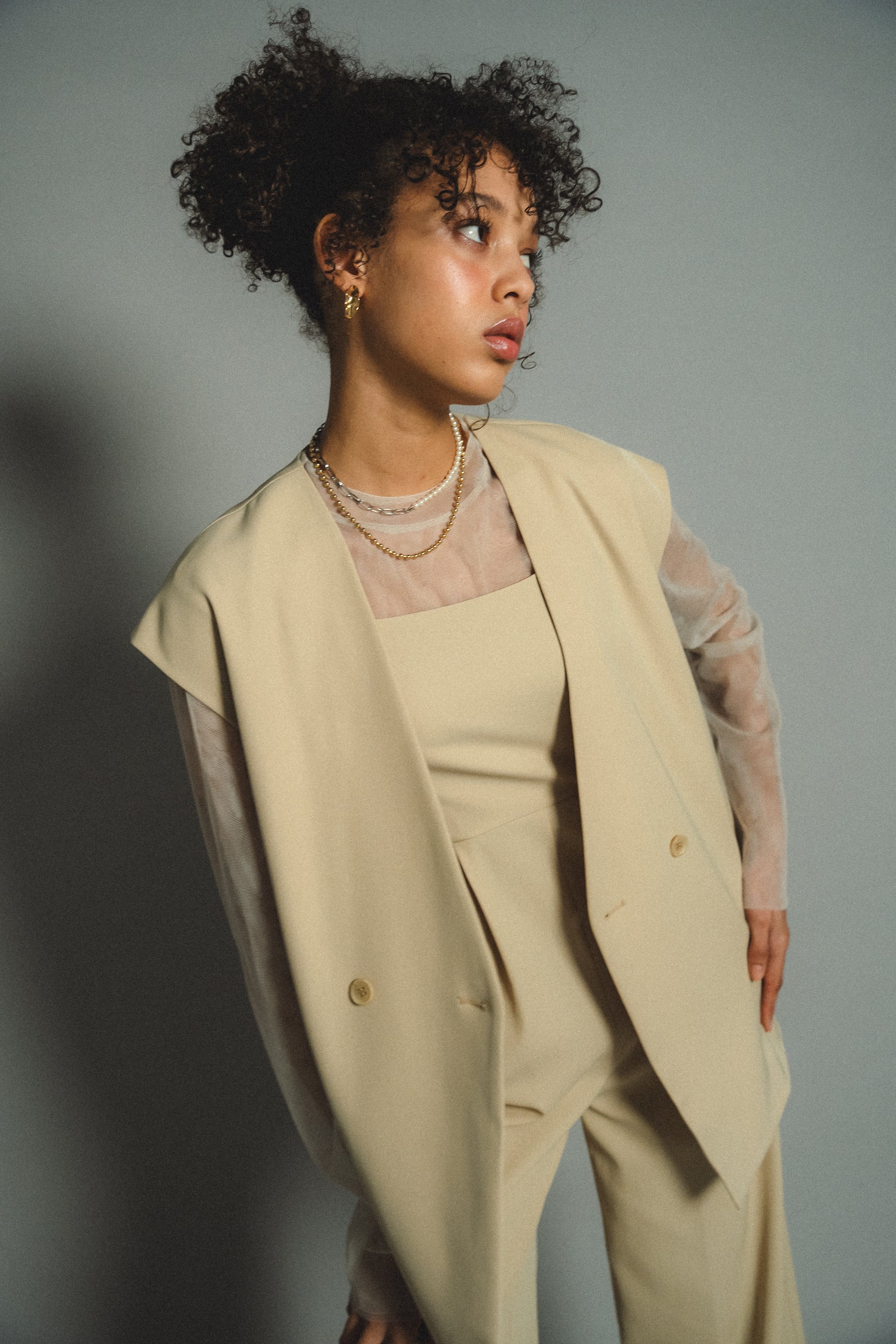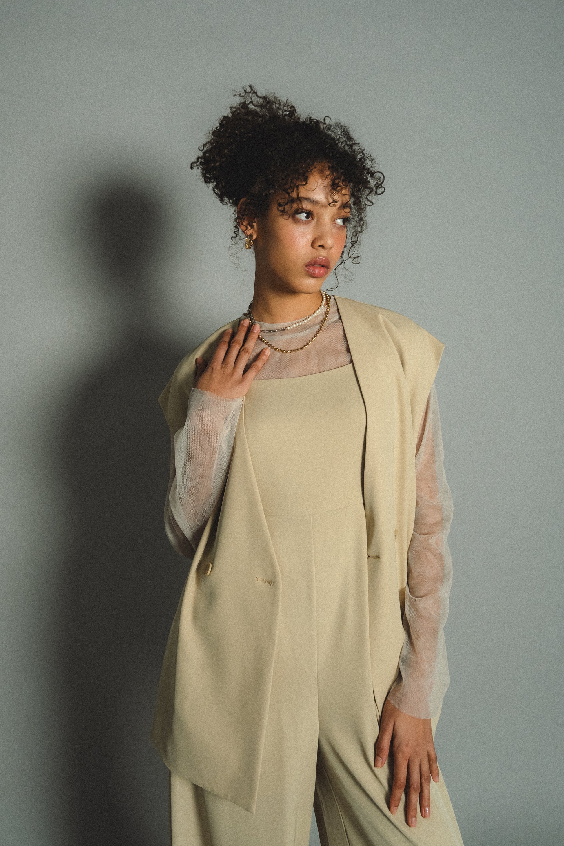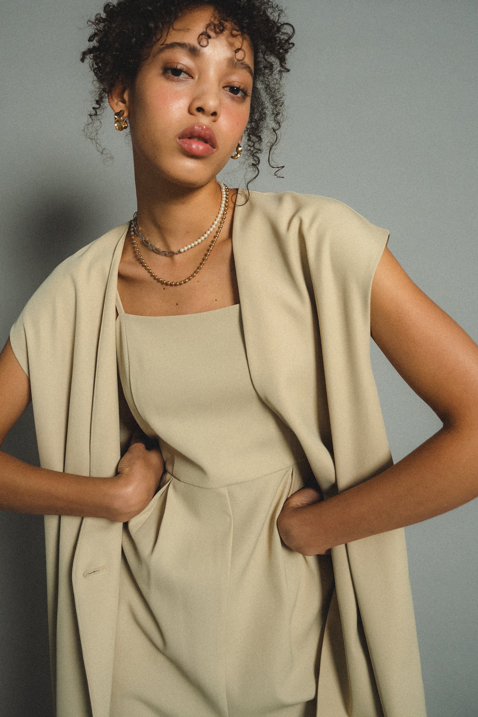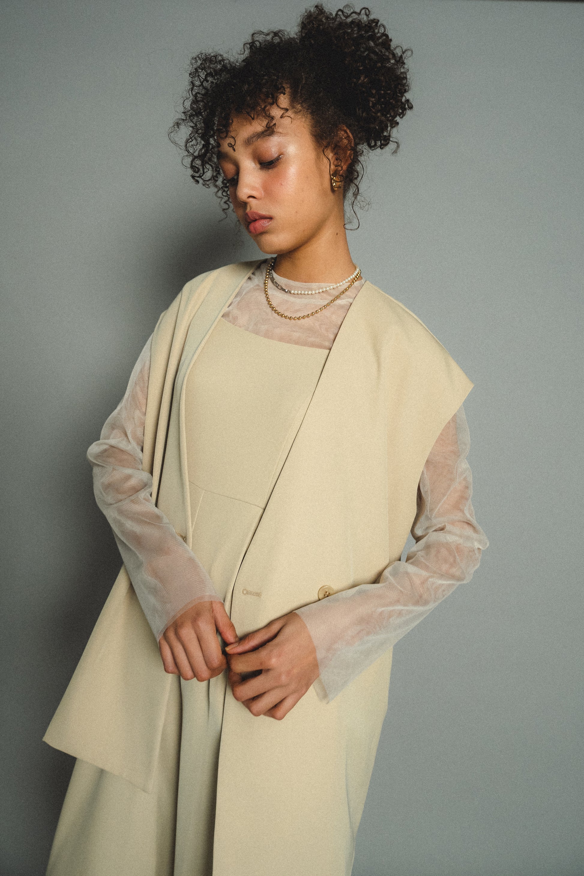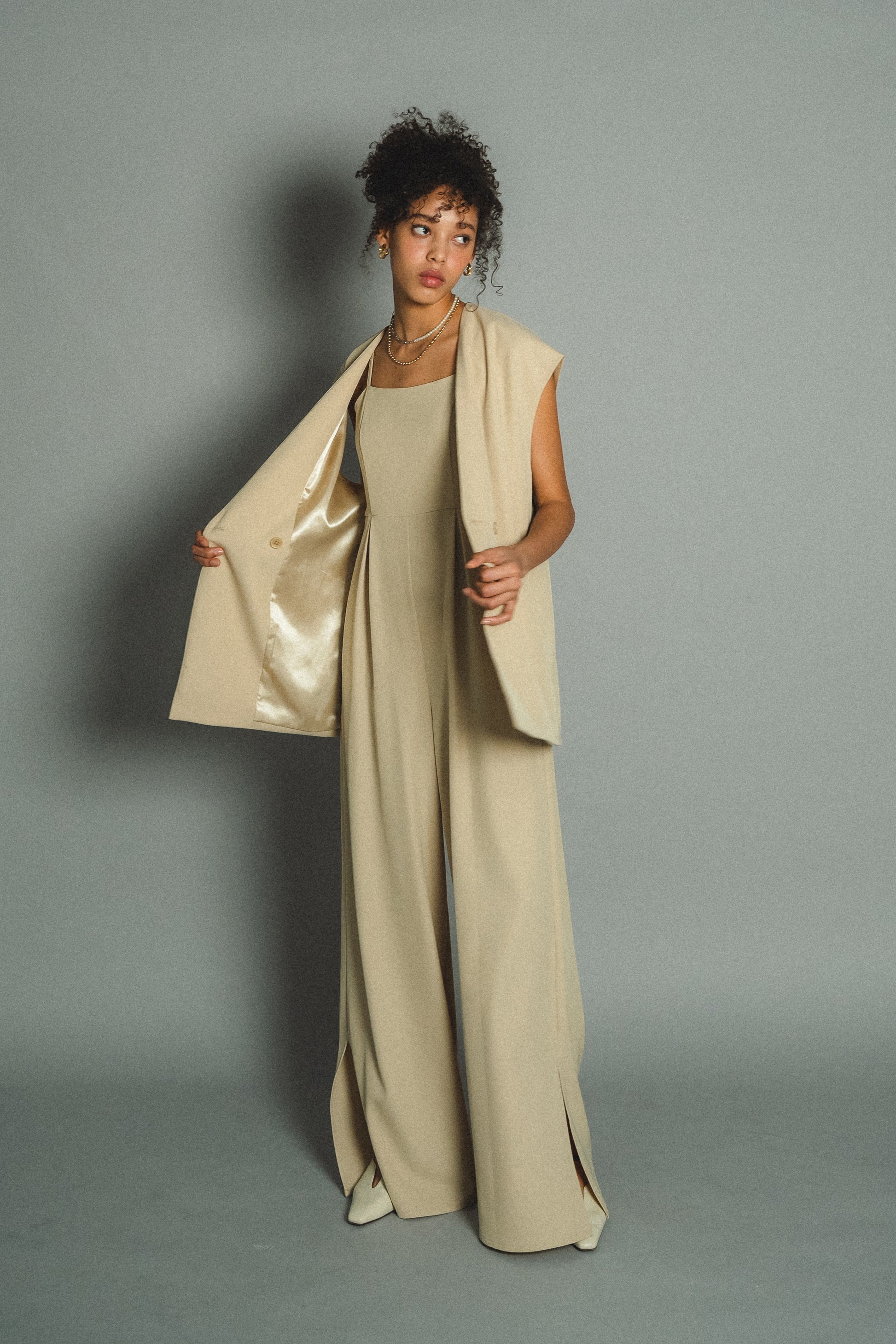 ・すっきりとしたノーカラーベストはヒップが隠れる長めの着丈でスタイルアップ効果も叶います