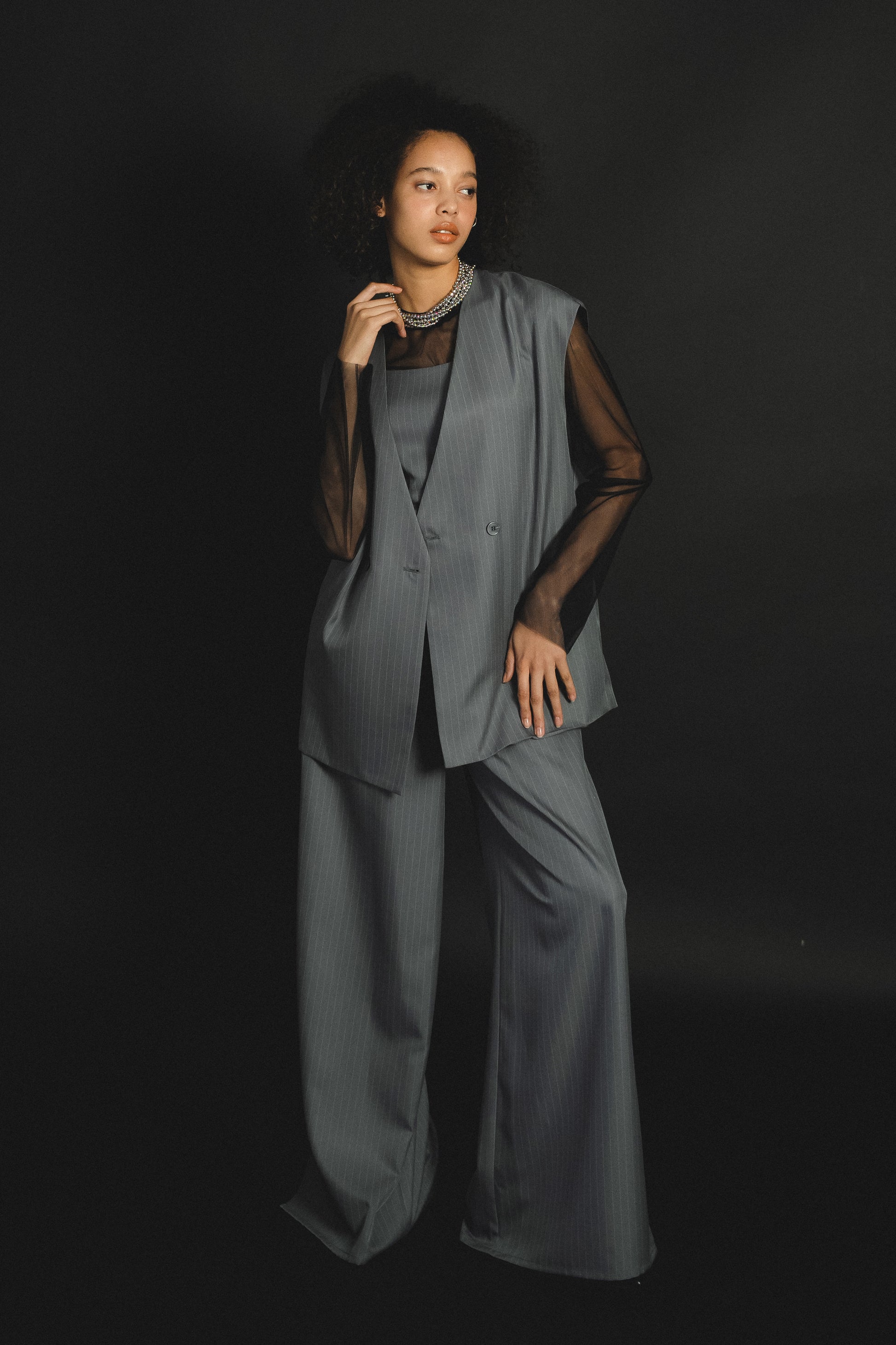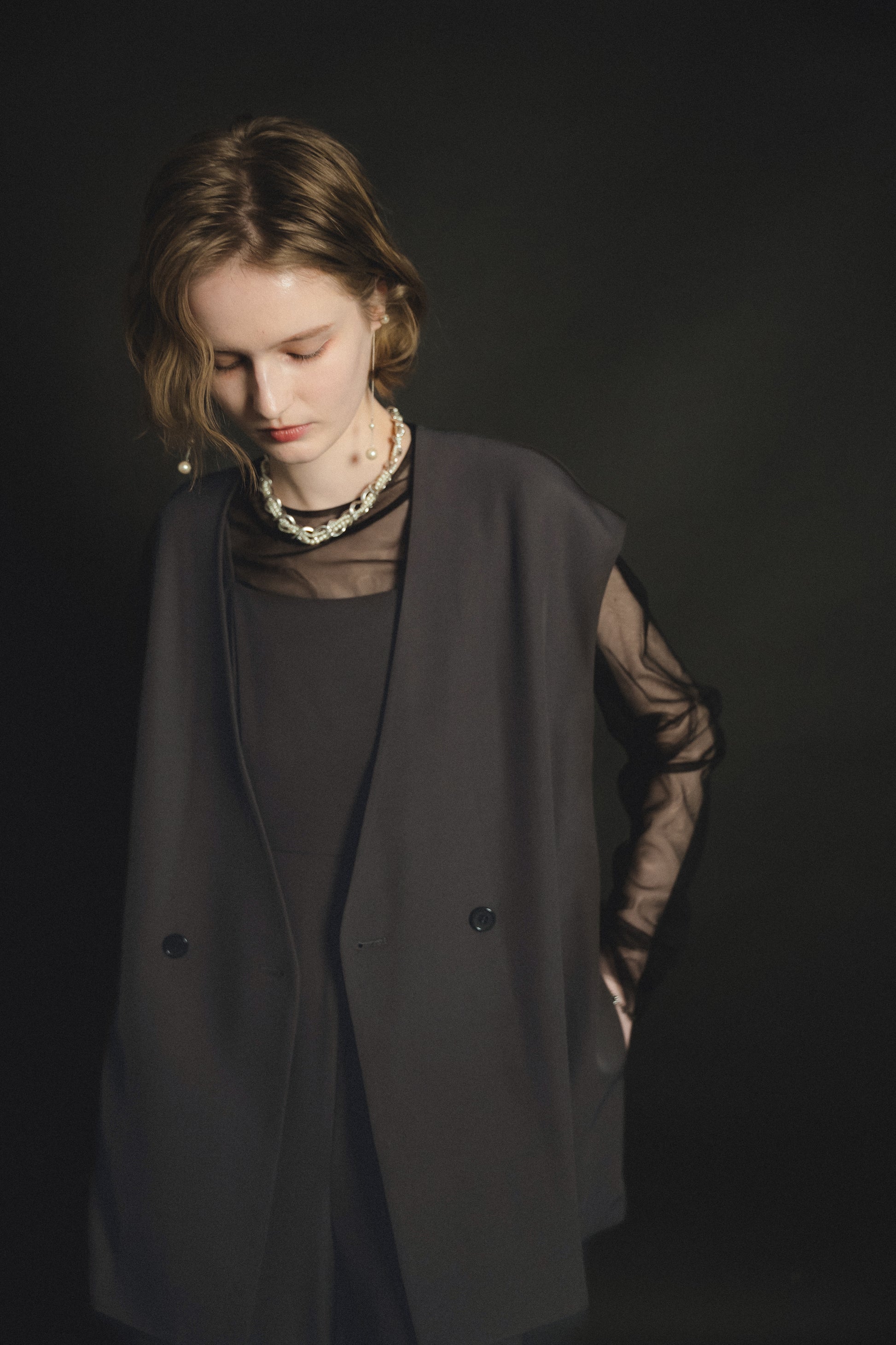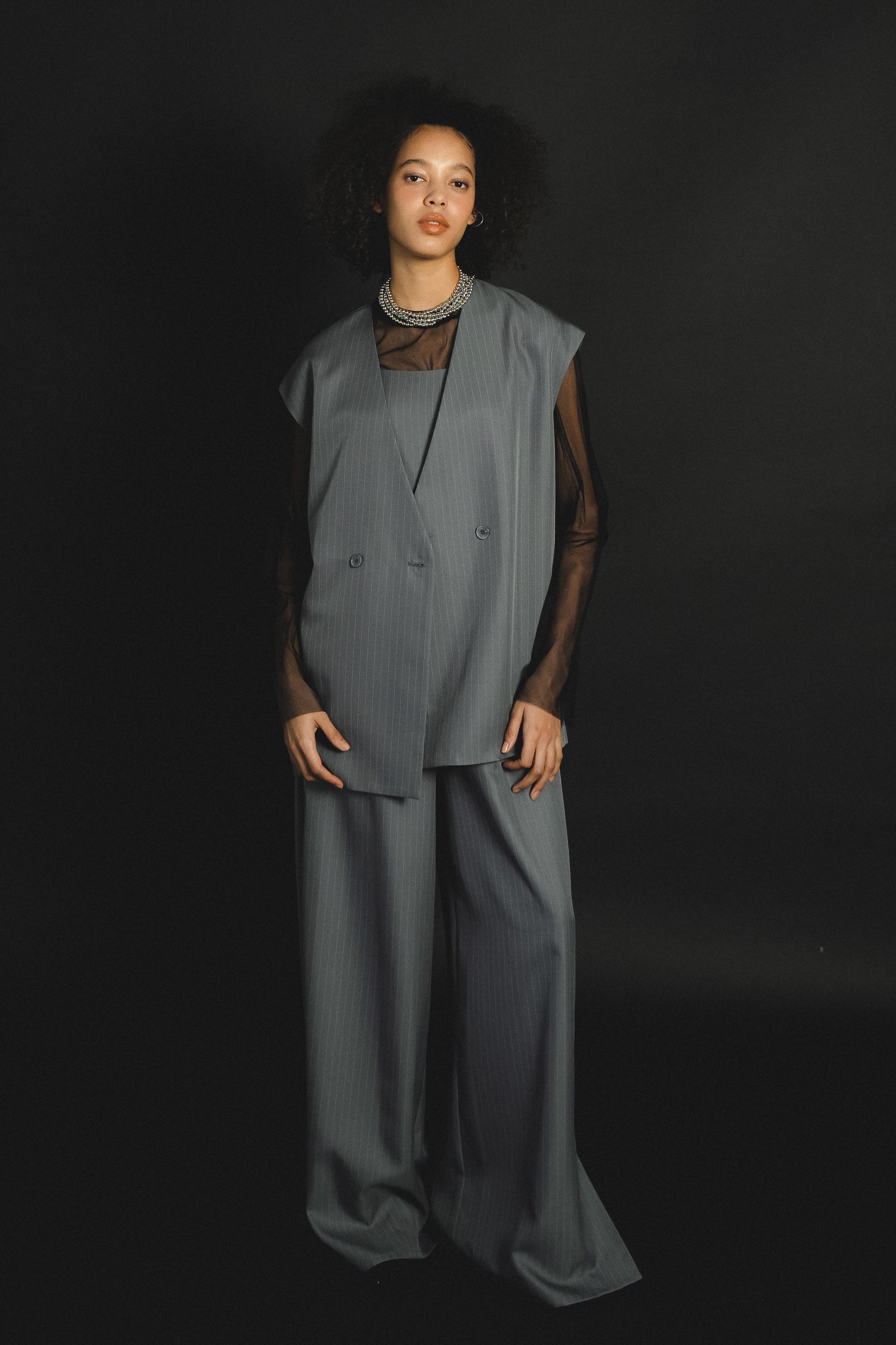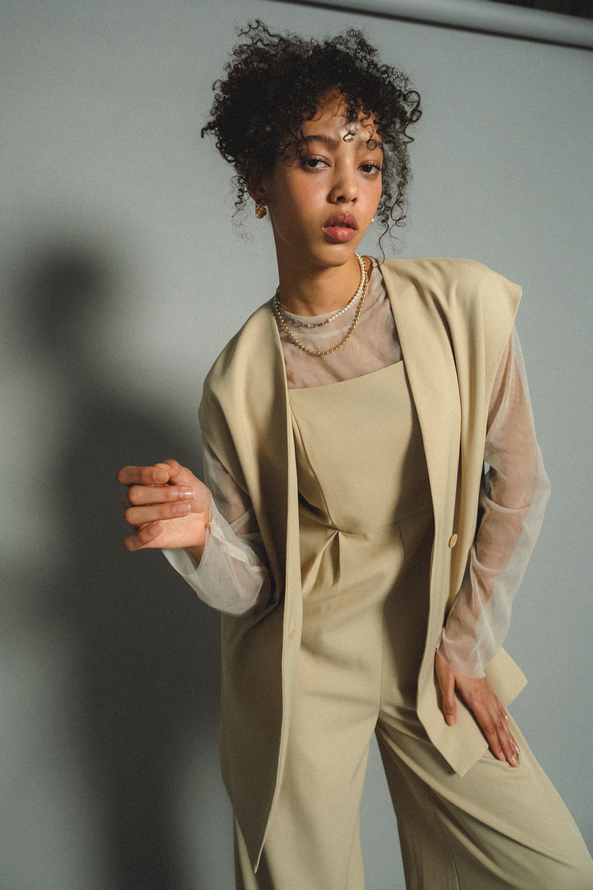 ・すっきりとしたノーカラーベストはヒップが隠れる長めの着丈でスタイルアップ効果も叶います