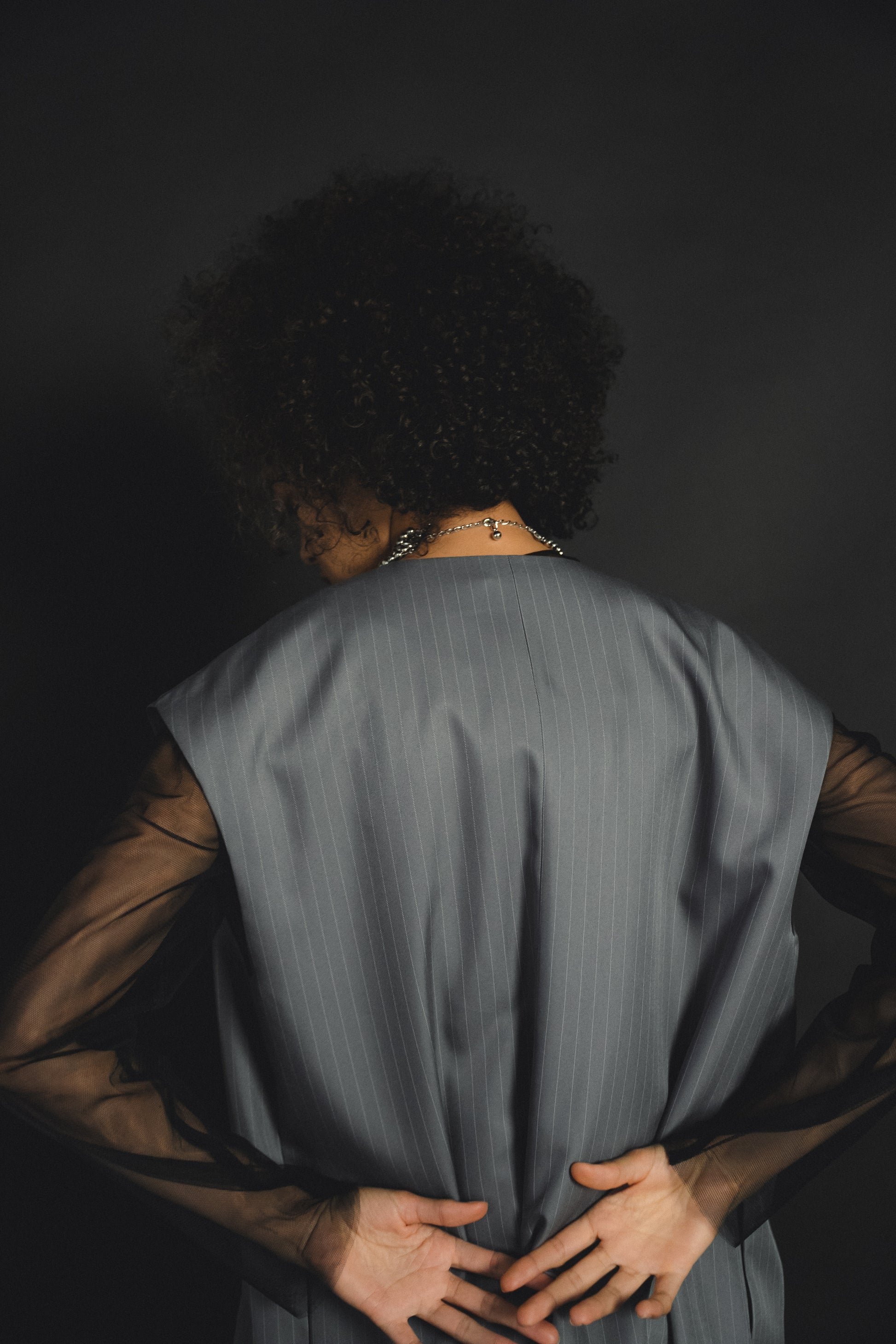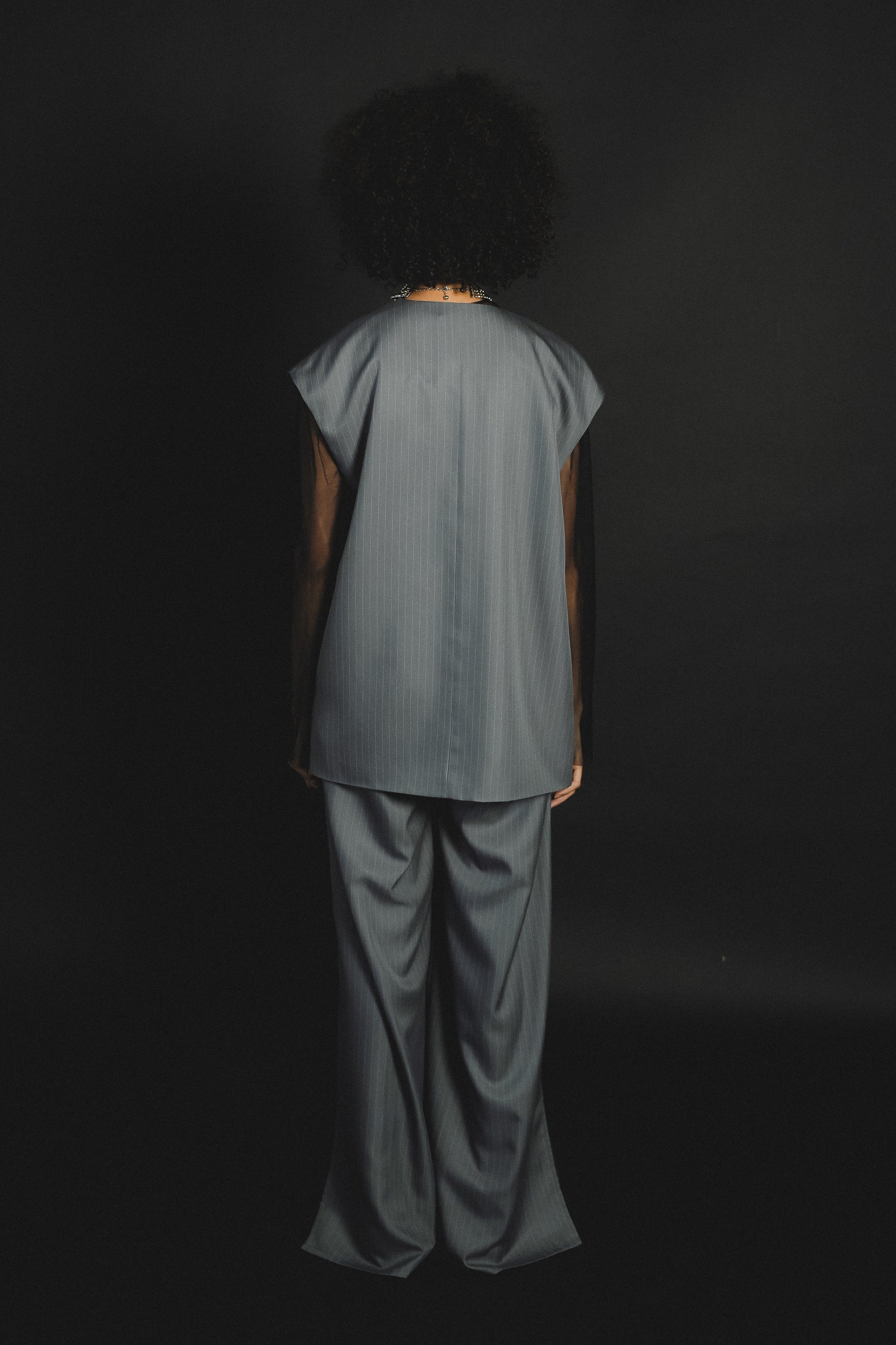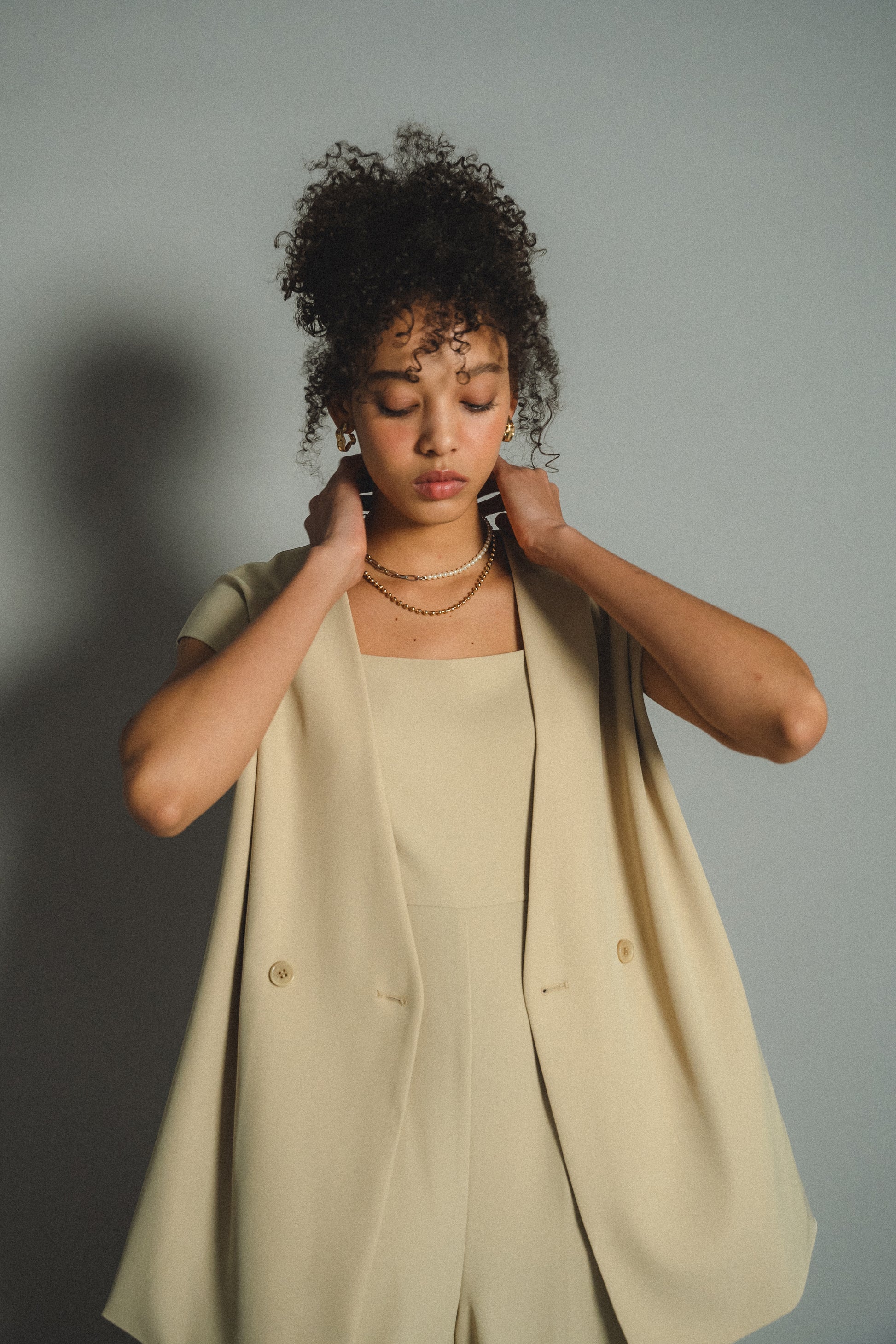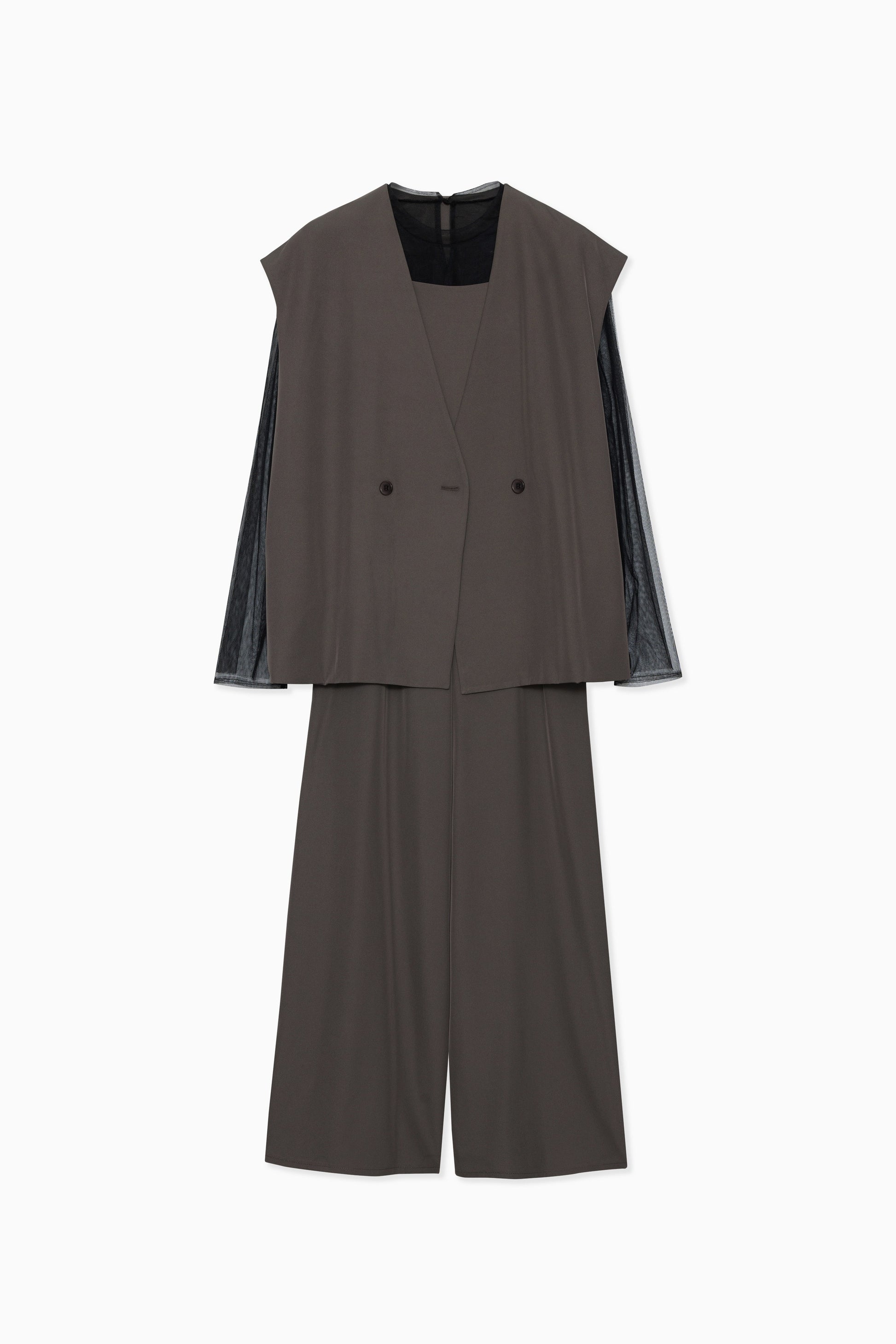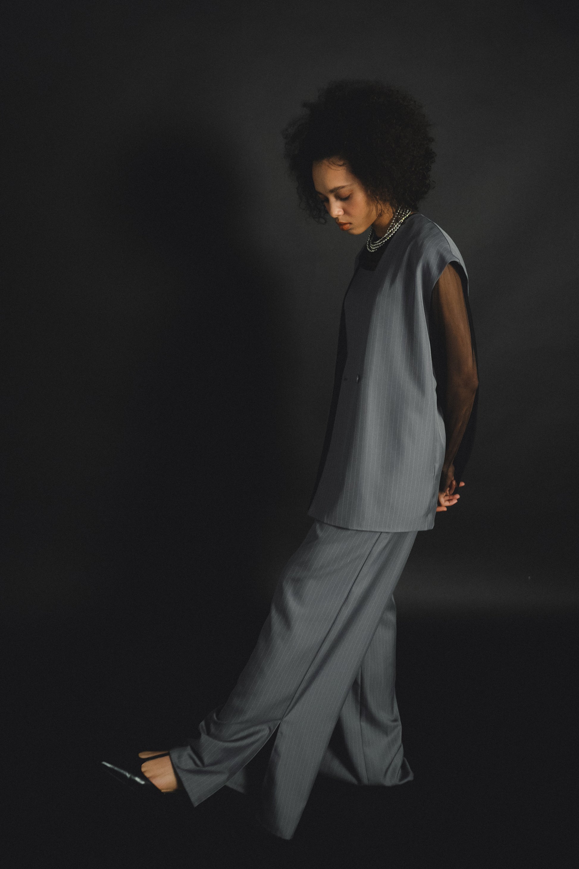 ・すっきりとしたノーカラーベストはヒップが隠れる長めの着丈でスタイルアップ効果も叶います